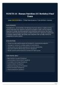 NUSCTX 10 – Human Nutrition (UC Berkeley) Final Exam (2025–2026 Latest Edition) is a verified exam-prep resource featuring 73 authentic questions with correct and rationalized answers. It covers seven core domains: basic nutrition concepts (malnutrition, digestion, absorption, dietary guidelines), carbohydrates, proteins & fats (energy sources, amino acids, proteolysis, dietary fiber, pregnancy/lactation needs), food safety & technology (FSMA, contamination risks, pathogens, audits, Noroviru...