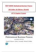 This complete test bank for Multinational Business Finance, 16th Edition by Eiteman & Stonehill includes all 18 chapters. It features multiple-choice, true/false, and problem-solving questions with accurate answers. Key topics include foreign exchange markets, international financial management, risk assessment, hedging, global capital budgeting, and multinational financial strategies. Ideal for undergraduate and graduate business students preparing for exams in international and corporate finan...