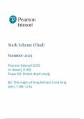 2025 PEARSON EDEXCEL GCSE HISTORY PAPER B2 MARK SCHEME (1HI0/B2: BOOKLET B2: The reigns of King Richard I and King John, 1189–1216)