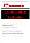 This document contains the post-test for LETRS Units 5 through 8, evaluating knowledge of advanced literacy concepts such as syntax, semantics, reading comprehension, and written expression. It assesses understanding of instructional strategies, classroom application, and research-based practices aligned with the science of reading. Ideal for educators completing the second half of LETRS training.