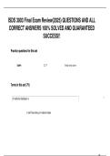 This document contains a complete set of verified questions with correct answers for the ISDS 3003 Final Exam (2025). It covers all key topics, including data analysis, statistical modeling, decision-making processes, and business analytics concepts. Detailed solutions and explanations are included to support effective revision, exam practice, and guaranteed success.