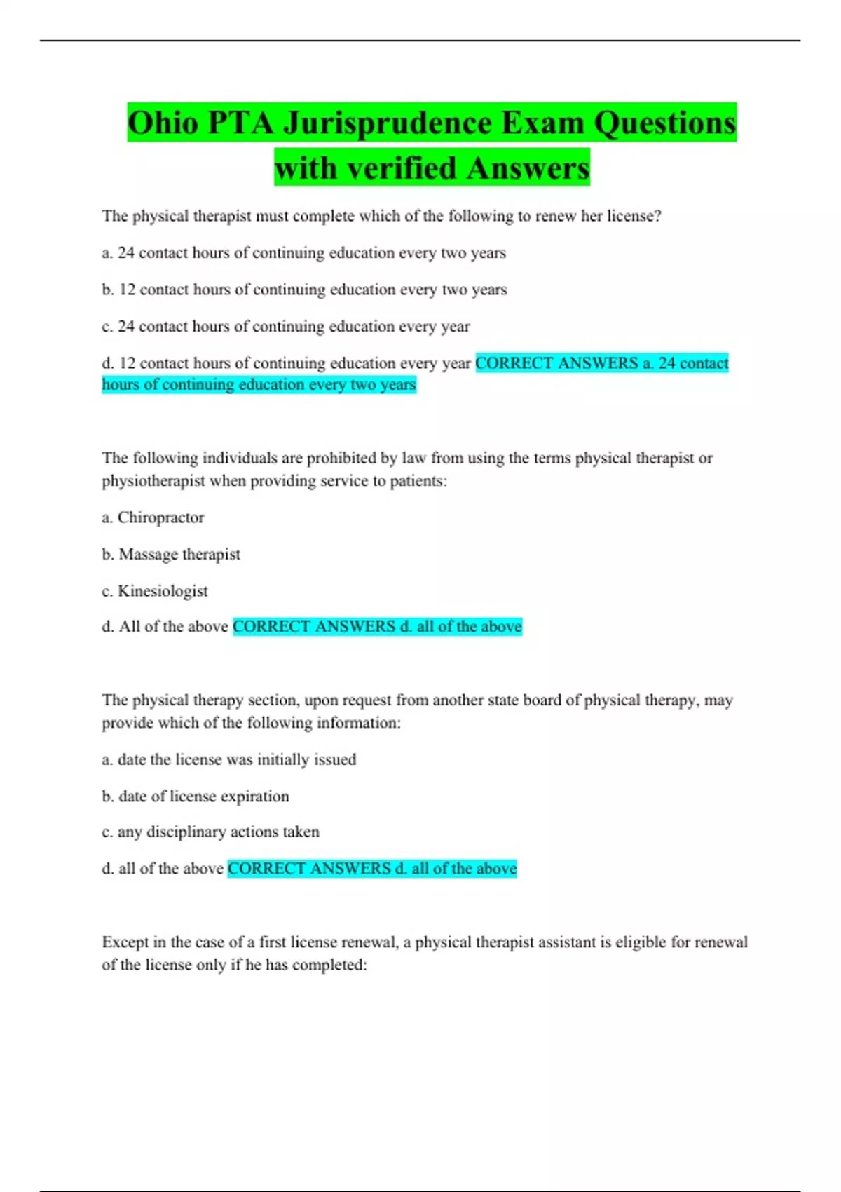 OHIO Physical Therapy Jurisprudence Exam Questions with correct solutions Ohio PT Jurisprudence Exam Test with complete Answers OHIO JURISPRUDENCE EXAM Questions and complete solutions Ohio PTA Jurisprudence Exam Questions with verified Answers