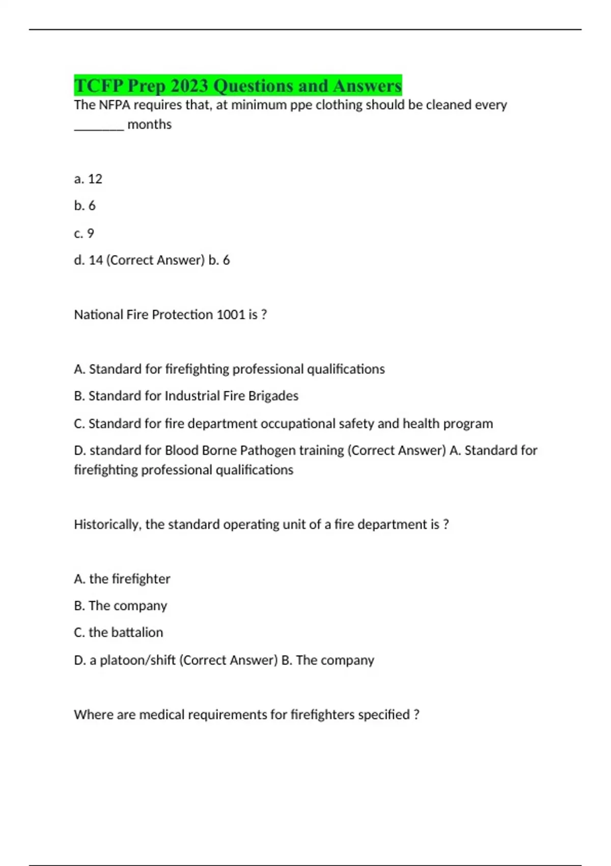 Tcfp HazMat Operations Possible 2022 Questions and Answers/TCFP Firefighter I/II Chapters 36-37 Test with complete solution/Fire Investigator - Master for TCFP Full Test Bank/20223 TCFP Possible Questions and Answers