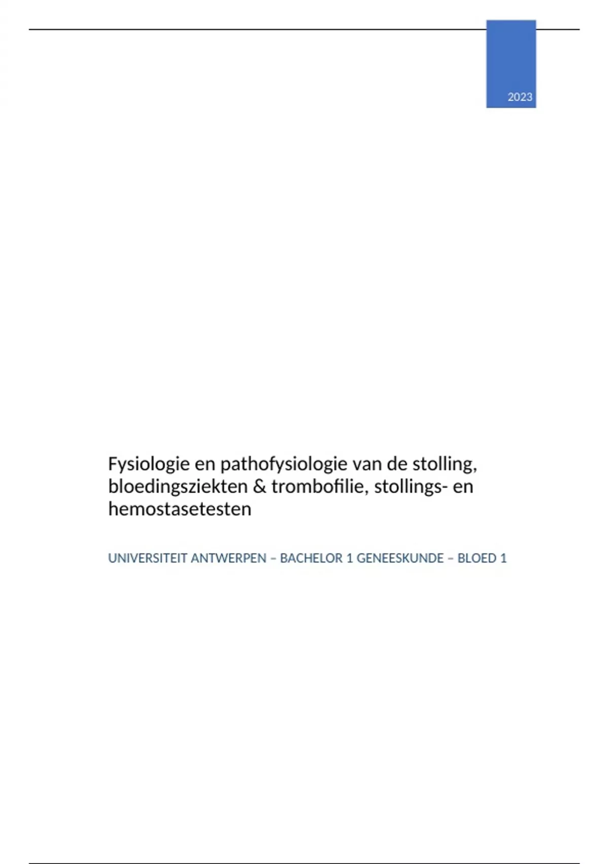 Deze bundel bestaat uit de samenvattingen van de onderdelen bloedstolling ziekten bloedgroepen. Dit vak wordt in het eerste jaar aan de UA gegeven. Deze samenvatting is uitgebreid en voldoende om te studeren voor het examen naast de bloedbeelden die zeker ook te kennen zijn aan de UA, maar die daar worden meegegeven.