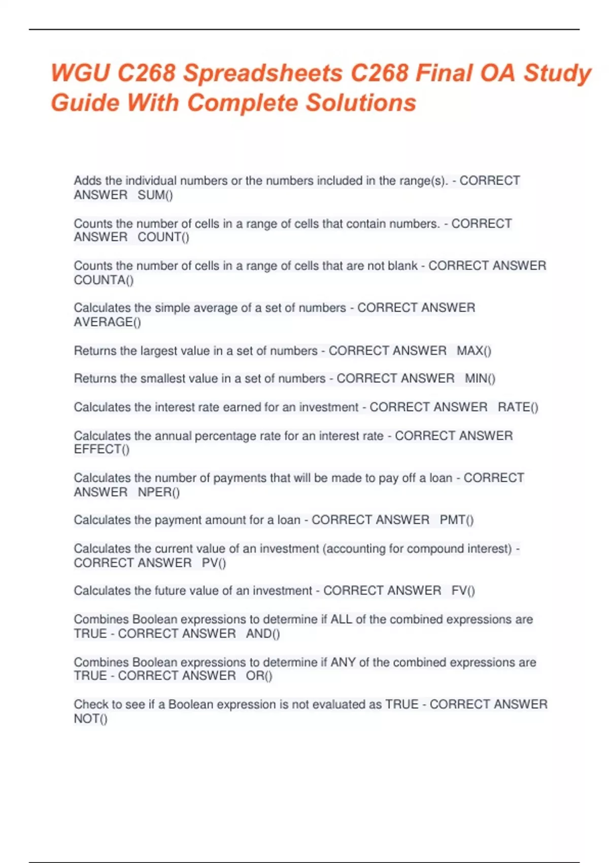 WGU C268 Spreadsheets BUNDLE Questions With 100% Verified Answers