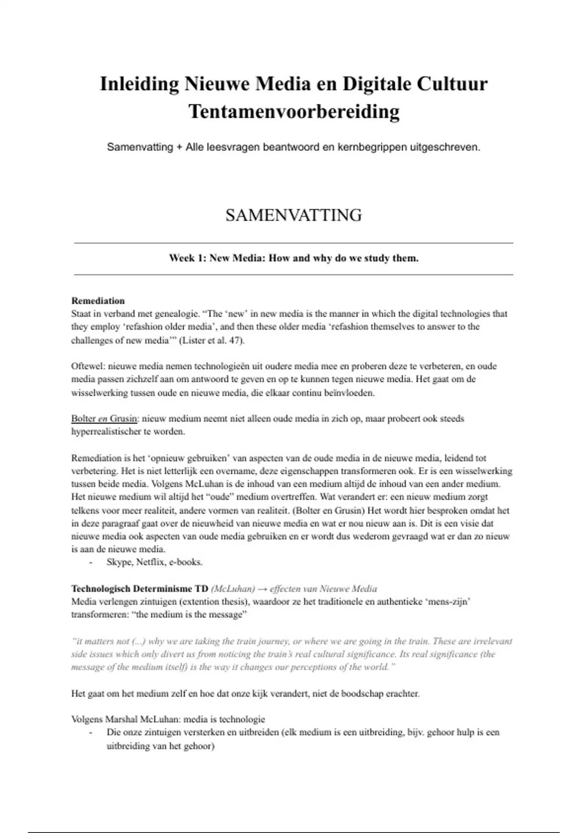 Voorbereiding voor Tentamens Blok 3 - jaar 1 Het document van Film bevat: samenvatting van de literatuur, een tijdlijn en een overzicht van de kenmerken van de films. Het document van Nieuwe media en Digitale Cultuur bevat een samenvatting van de stof uit de literatuur en de colleges, de antwoorden op de leesvragen en de kernbegrippen uitgewerkt.