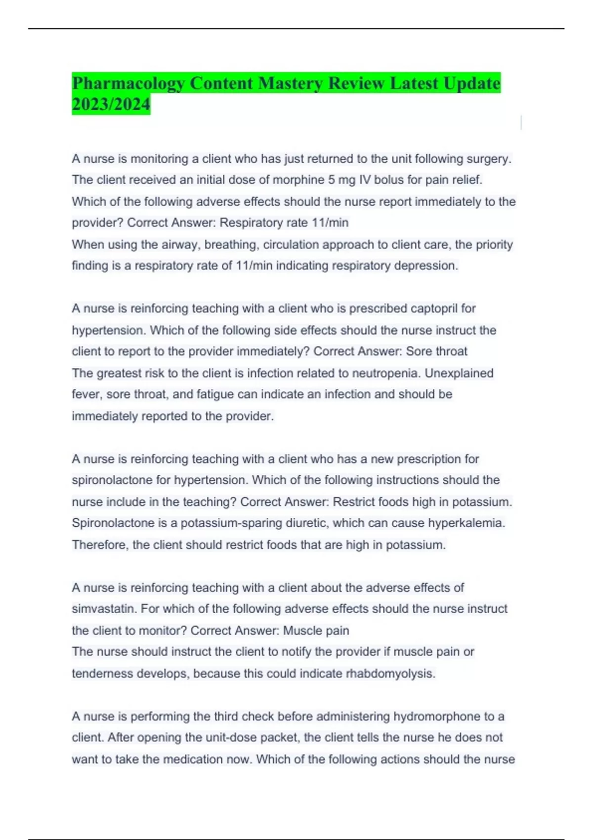 ATI Content Mastery Fundamentals Exam With Verified & A+ Rated Answers Pharmacology Content Mastery Review Latest Update 2023/2024 Pharmacology Content Mastery Series Review 2023/2024