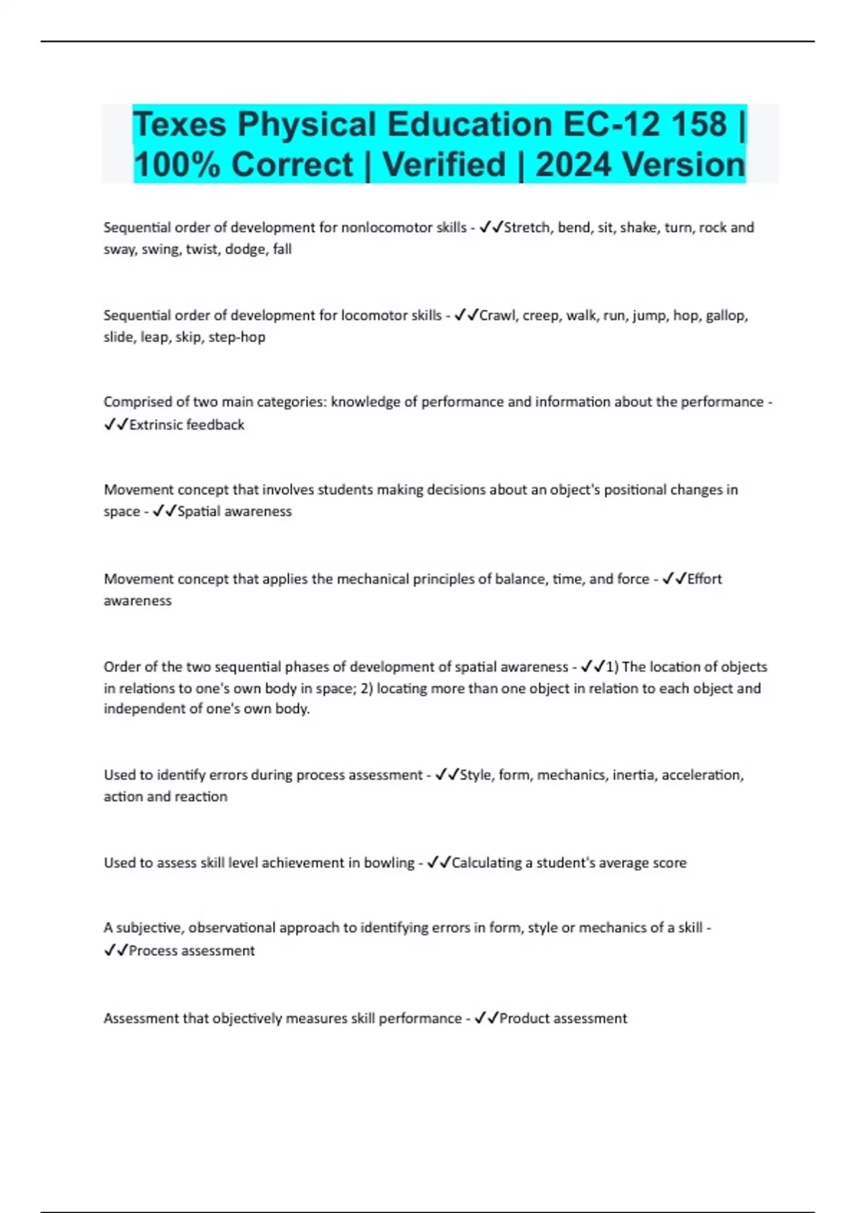 Texes Physical Education EC-12 158 | 100% Correct | Verified | 2024 Version