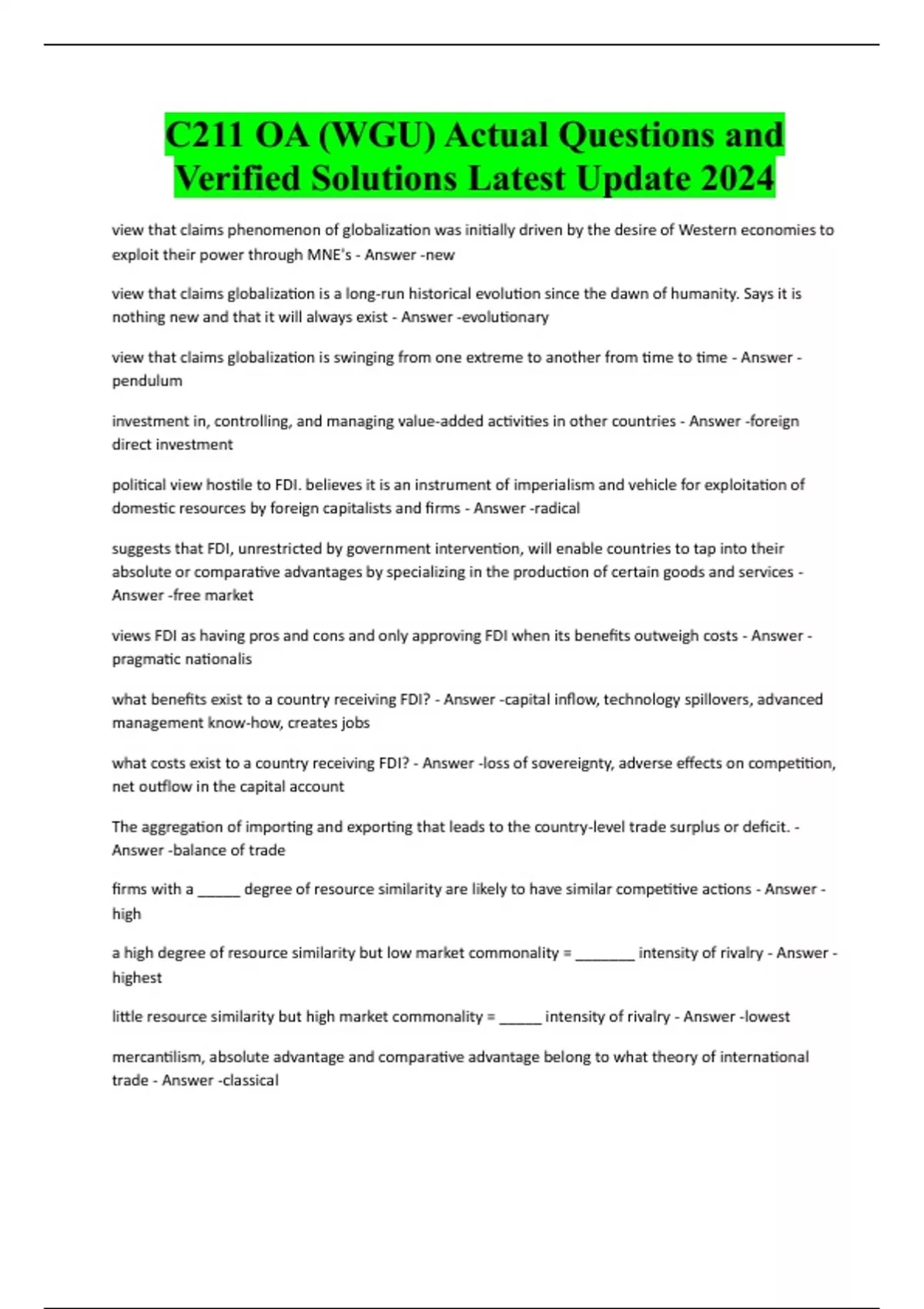 WGU C211 OA BUNDLED Exams and Verified Solutions 2024 | 2025. Global Economics, Quizzes, Actual Tests, Study Guides