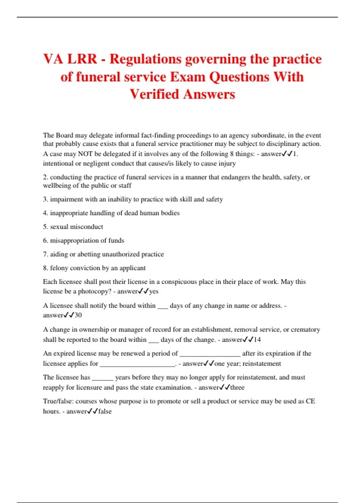 VA LRR - Regulations governing the practice of funeral service Exam Questions With Verified Answers