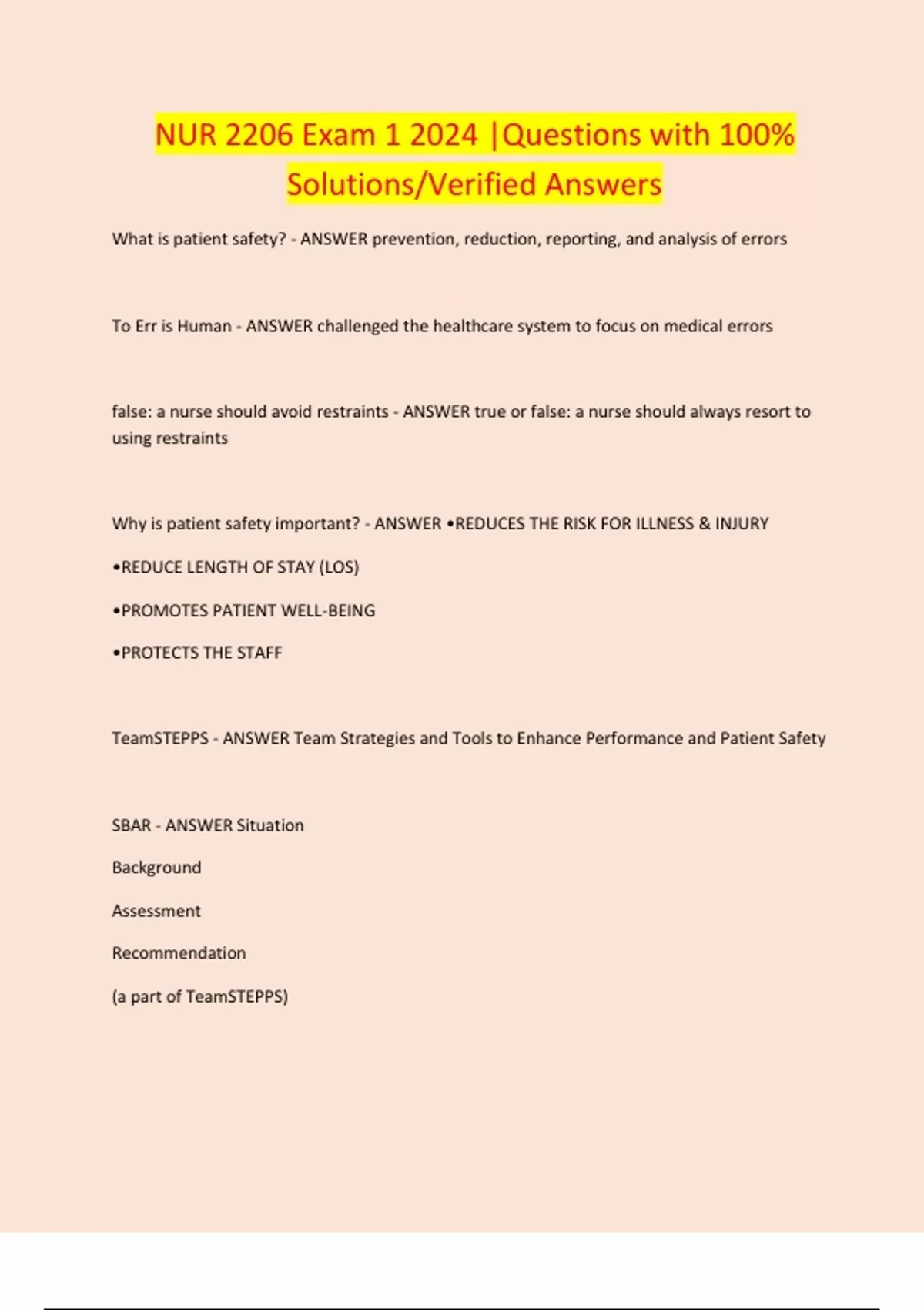 NUR 2206 Exam 1 2024 |Questions with 100% Solutions/Verified Answers