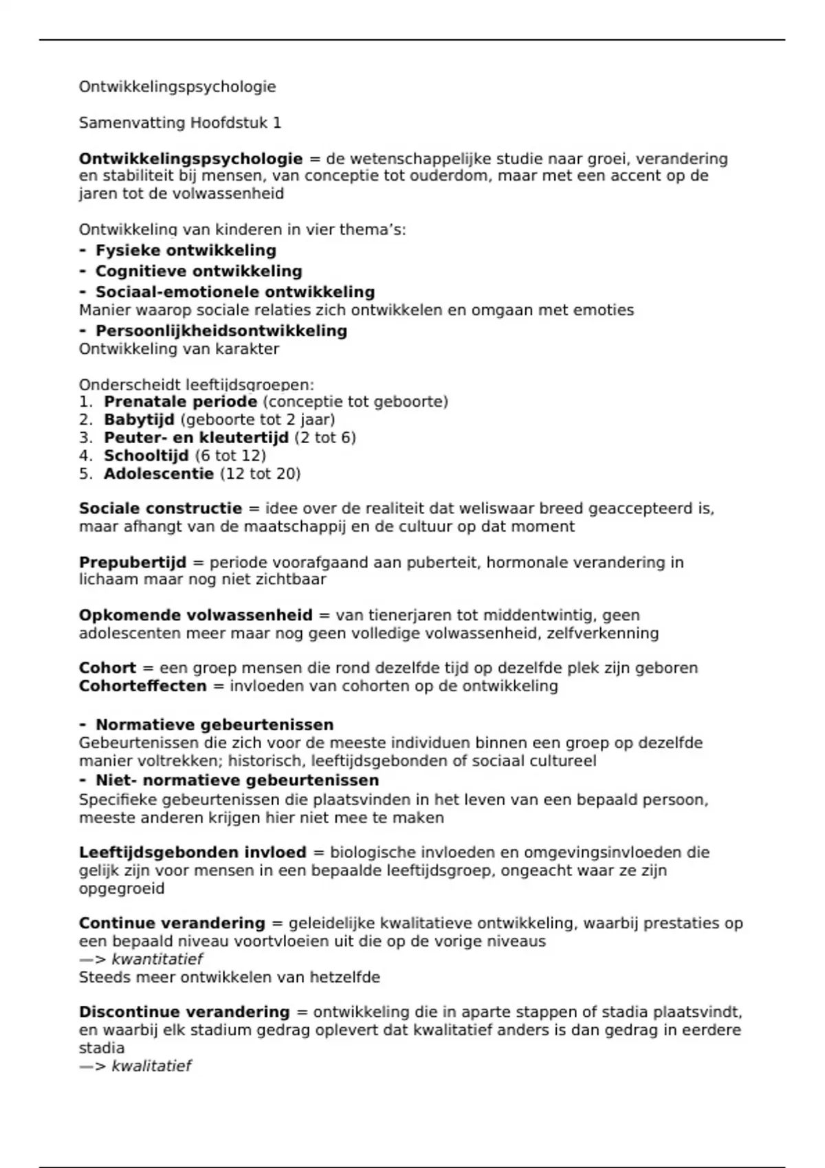 Samenvatting ontwikkelingspsychologie NTI leerjaar 1 bachelor toegepaste psychologie hoofdstuk 1 tm 15