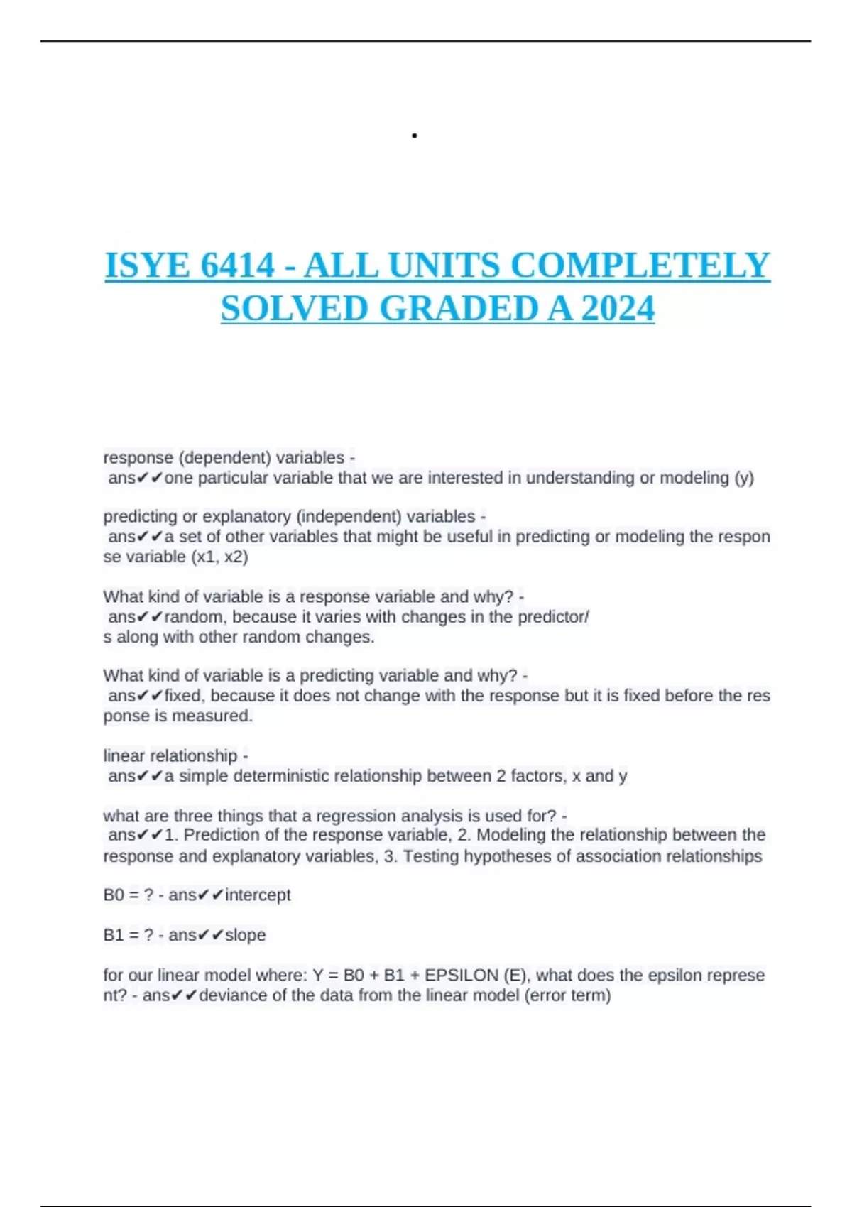 ISYE 6414 FINAL EXAM QUESTIONS AND VERIFIED ANSWERS 2024