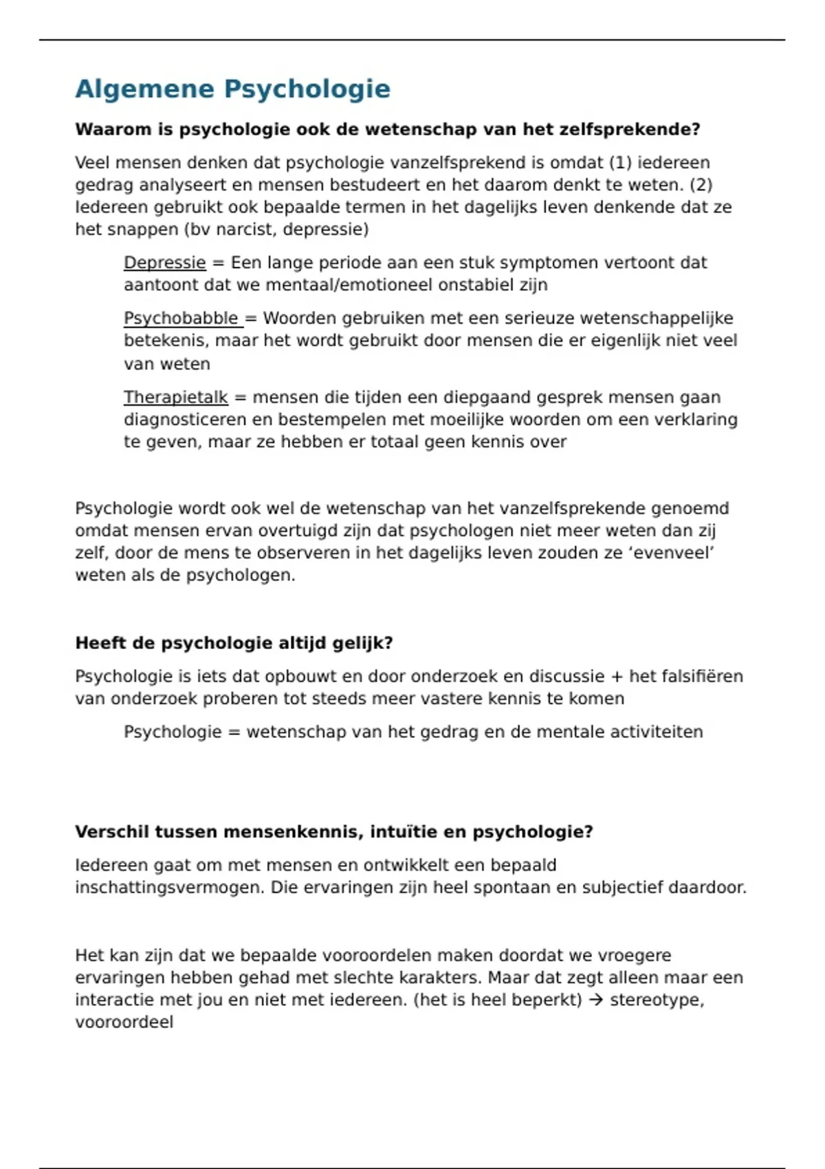 Dit is een samenvatting van heel het semester psychologie. Algemene psychologie en Sociale psychologie zijn hier beiden in verwerkt. Ik ben naar alle lessen geweest en ik had al een grote voorkennis voor dit vak dus heb alles grondig kunnen uitleggen. Succes!