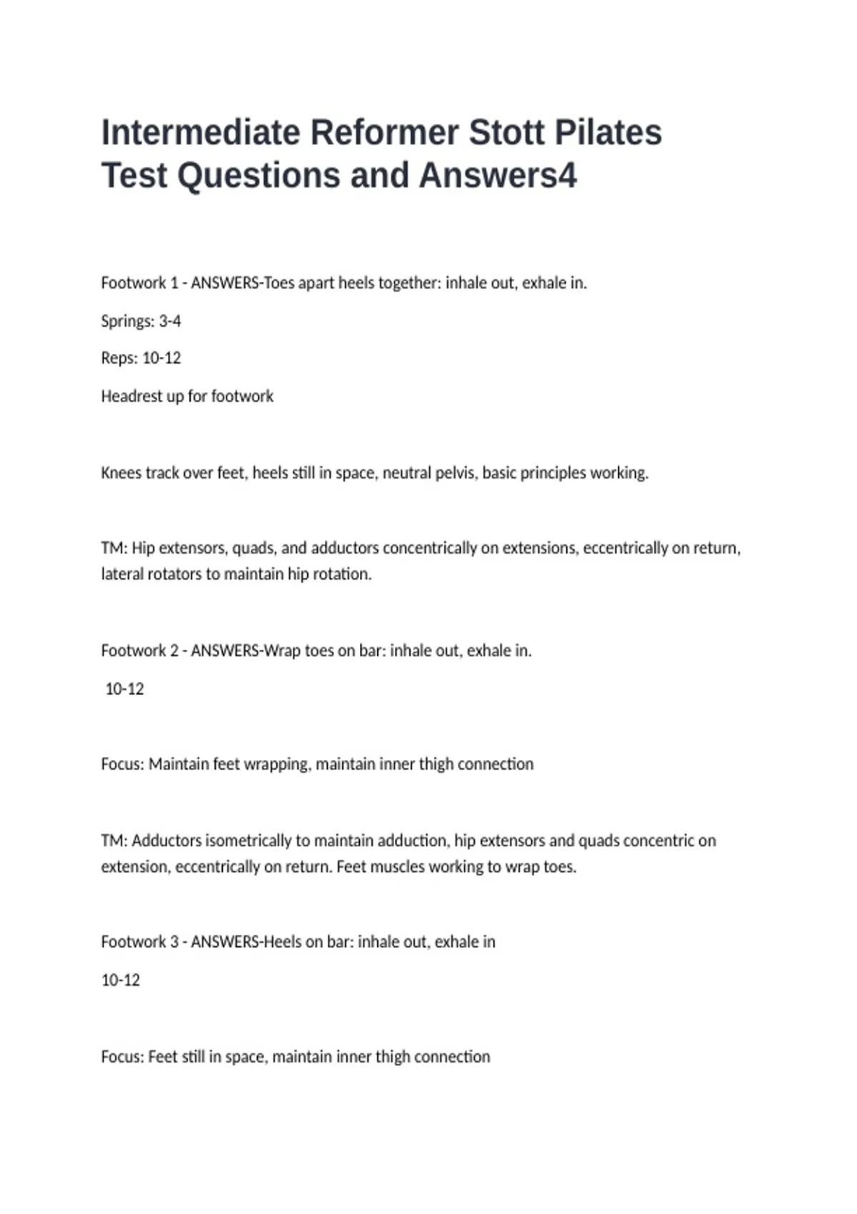 Intermediate Reformer Stott Pilates Test Questions and Answers