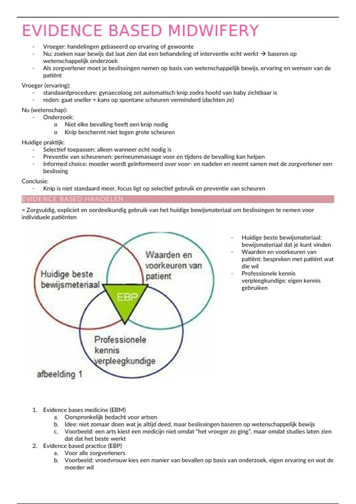 Dit document beschrijft het concept van evidence based midwifery (EBM, EBP), de toepassing in de praktijk, richtlijnen, protocollen en standaarden, en bronnen om actuele wetenschappelijke kennis te raadplegen. Het legt uit hoe zorgverleners beslissingen nemen op basis van wetenschappelijk bewijs, professionele ervaring en voorkeuren van de moeder.