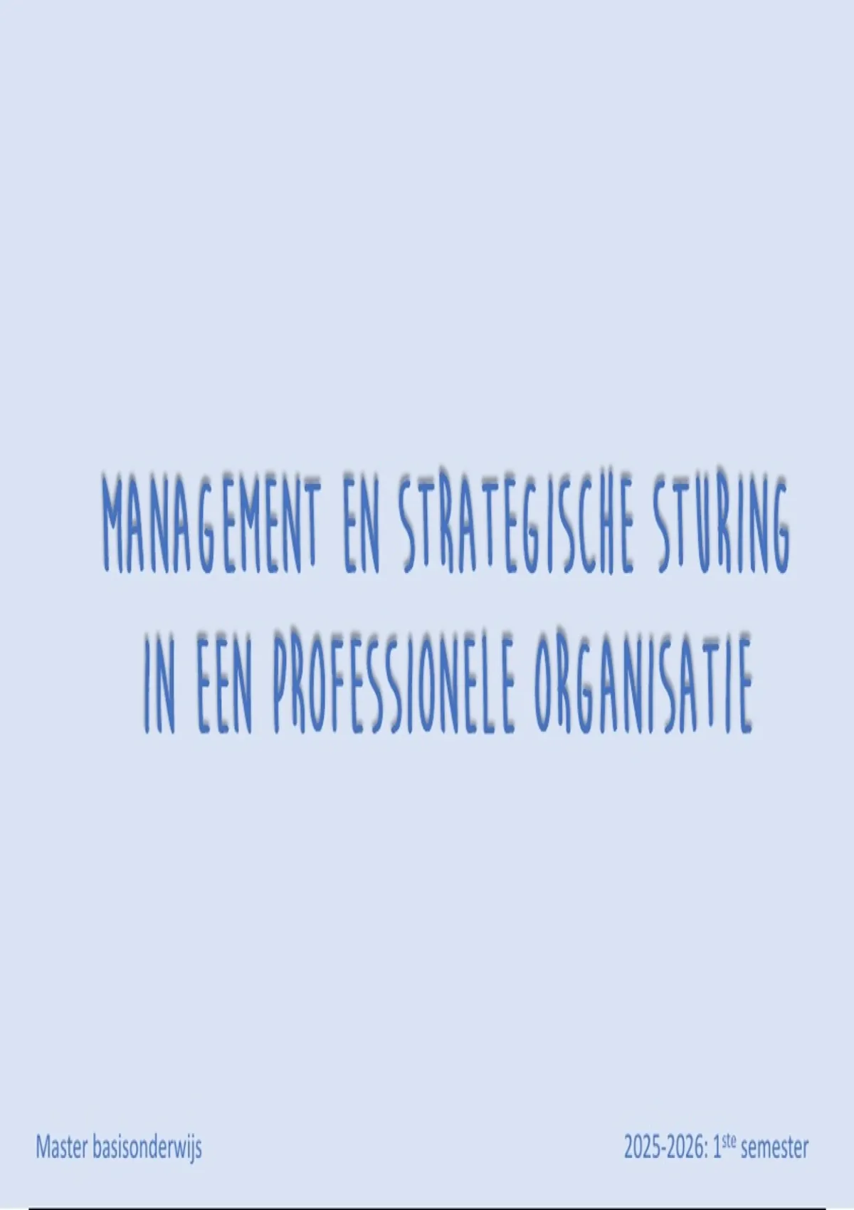 MANAGEMENT EN STRATEGISCHE STURING (MSS) - Beknopt overzicht Deze samenvatting bevat het beknopte overzicht van het vak 'Management en strategische sturing' (MSS) uit het masterjaar van opleidings- en onderwijswetenschappen (OOW) of basisonderwijs (BaO).