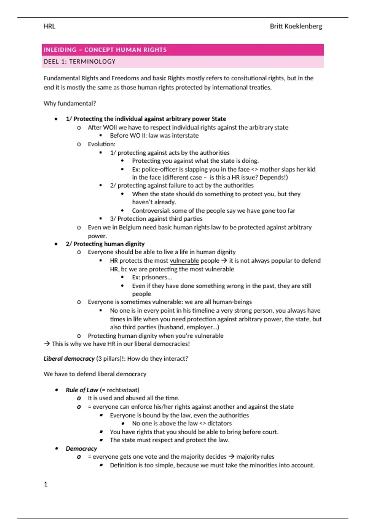 Dit zijn mijn lesnotities in het engels van Human Rights Law. Het bevat alle arresten die de professor heeft besproken en op de powerpoint staan, met verwijzing naar de paragrafen in het arrest. Deze samenvatting bevat ook alle cases and questions die de professor heeft besproken in de les. Het kan zijn dat er wat taalfoutjes in staan :))