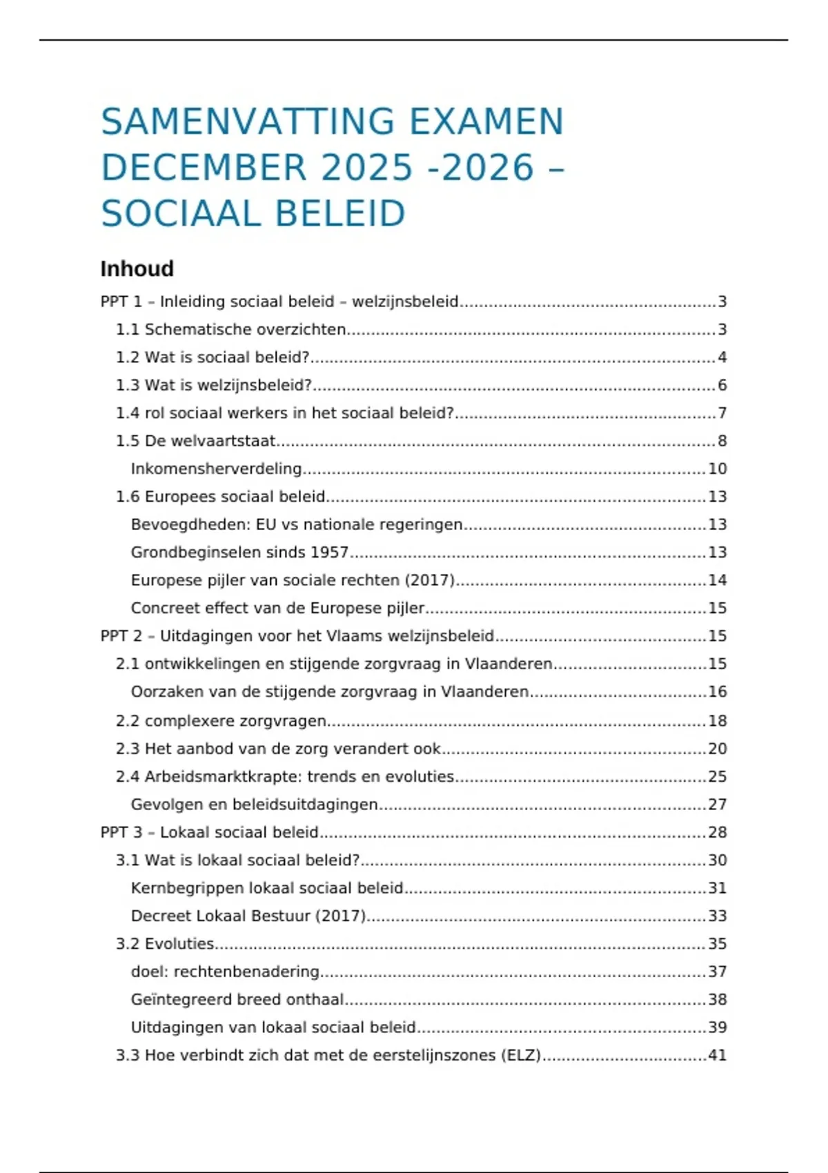 Dit is een uitgebreide en overzichtelijke samenvatting voor het vak Sociaal Beleid. Ze is speciaal opgebouwd voor het openboekexamen en bevat een duidelijke structuur met inhoudstafel, waardoor je snel en efficiënt de juiste informatie kan terugvinden tijdens het examen. Ideaal om te studeren én te gebruiken als hulpmiddel tijdens het examen.