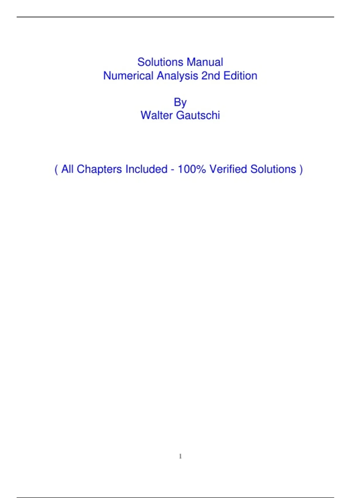 This is a complete solutions manual PDF for Numerical Analysis 2nd Edition By Walter Gautschi. It provides detailed, step-by-step answers to all exercises and problems.