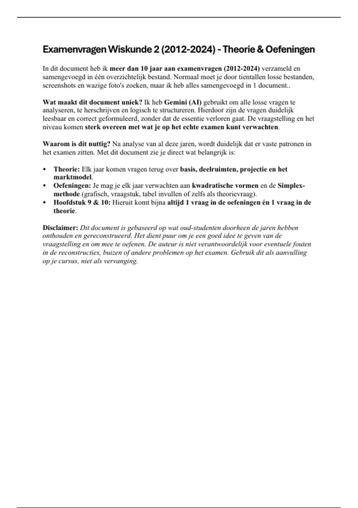 In dit document heb ik meer dan 10 jaar aan examenvragen () verzameld en samengevoegd in één overzichtelijk bestand. Normaal moet je door tientallen losse bestanden, screenshots en wazige foto's zoeken, maar ik heb alles samengevoegd in 1 document.. Wat maakt dit document uniek? Ik heb Gemini (AI) gebruikt om alle losse vragen te analyseren, te herschrijven en logisch te structureren. Hierdoor zijn de vragen duidelijk leesbaar en correct geformuleerd, zonder dat de essentie verloren gaat. De vraagstelling en het niveau komen sterk overeen met wat je op het echte examen kunt verwachten. Waarom is dit nuttig? Na analyse van al deze jaren, wordt duidelijk dat er vaste patronen in het examen zitten. Met dit document zie je direct wat belangrijk is: • Theorie: Elk jaar komen vragen terug over basis, deelruimten, projectie en het marktmodel. • Oefeningen: Je mag je elk jaar verwachten aan kwadratische vormen en de Simplex-methode (grafisch, vraagstuk, tabel invullen of zelfs als theorievraag). • Hoofdstuk 9 & 10: Hieruit komt bijna altijd 1 vraag in de oefeningen én 1 vraag in de theorie. Disclaimer: Dit document is gebaseerd op wat oud-studenten doorheen de jaren hebben onthouden en gereconstrueerd. Het dient puur om je een goed idee te geven van de vraagstelling en om mee te oefenen. De auteur is niet verantwoordelijk voor eventuele fouten in de reconstructies, buizen of andere problemen op het examen. Gebruik dit als aanvulling op je cursus, niet als vervanging