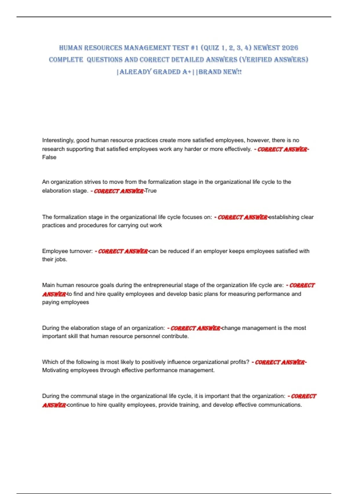 Human ResouRces management test #1 (Quiz 1, 2, 3, 4) neWest 2026 comPLete Questions anD coRRect DetaiLeD ansWeRs (VeRiFieD ansWeRs) |aLReaDY gRaDeD a+||BRanD neW!!