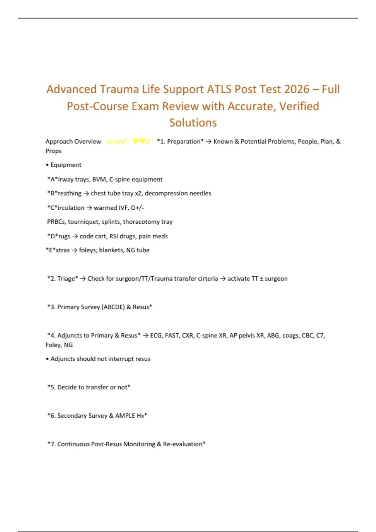 *4. Adjuncts to Primary & Resus* → ECG, FAST, CXR, C-spine XR, AP pelvis XR, ABG, coags, CBC, C7,