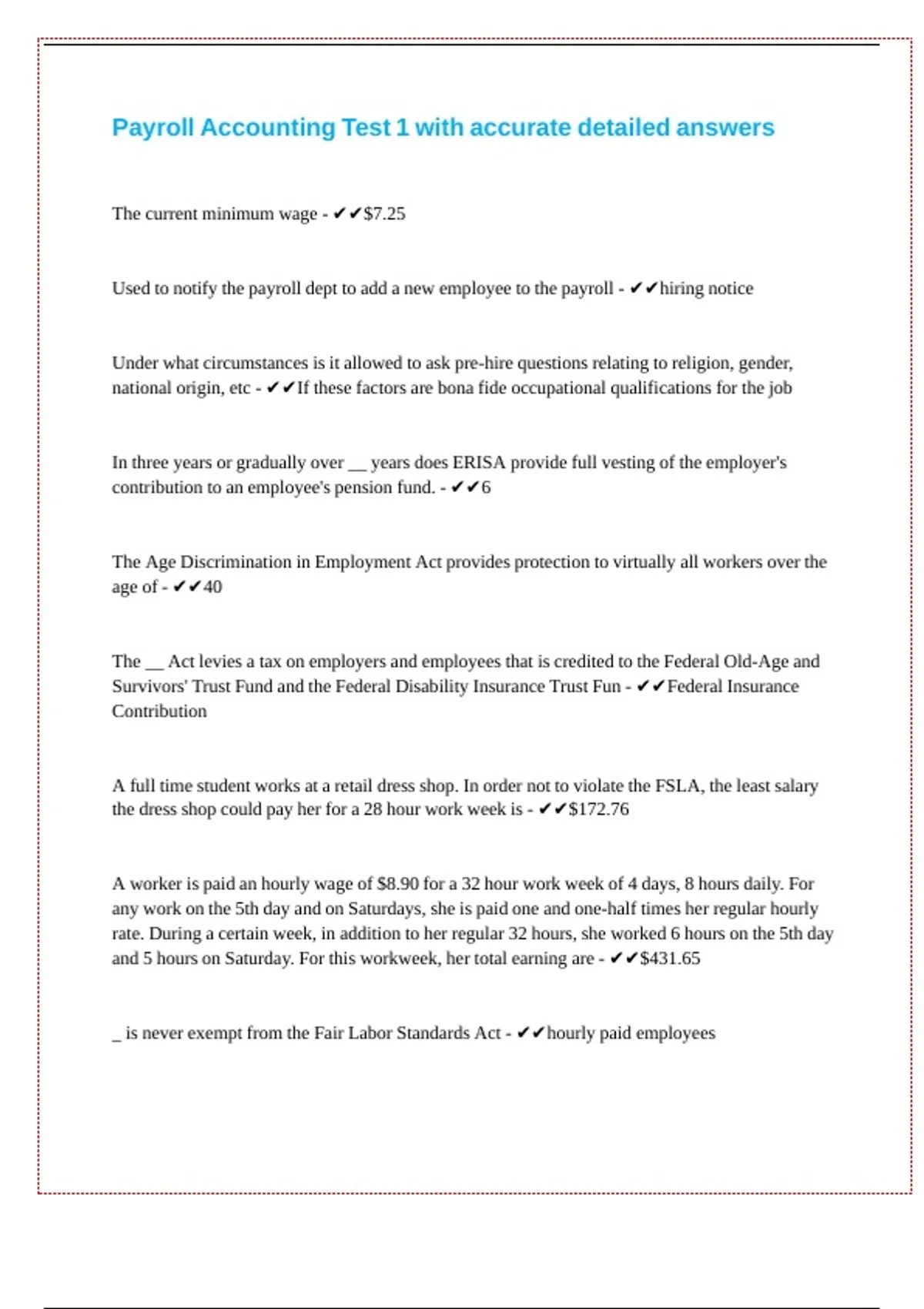 Payroll Accounting Test 1 with accurate detailed answers || || || || || || ||