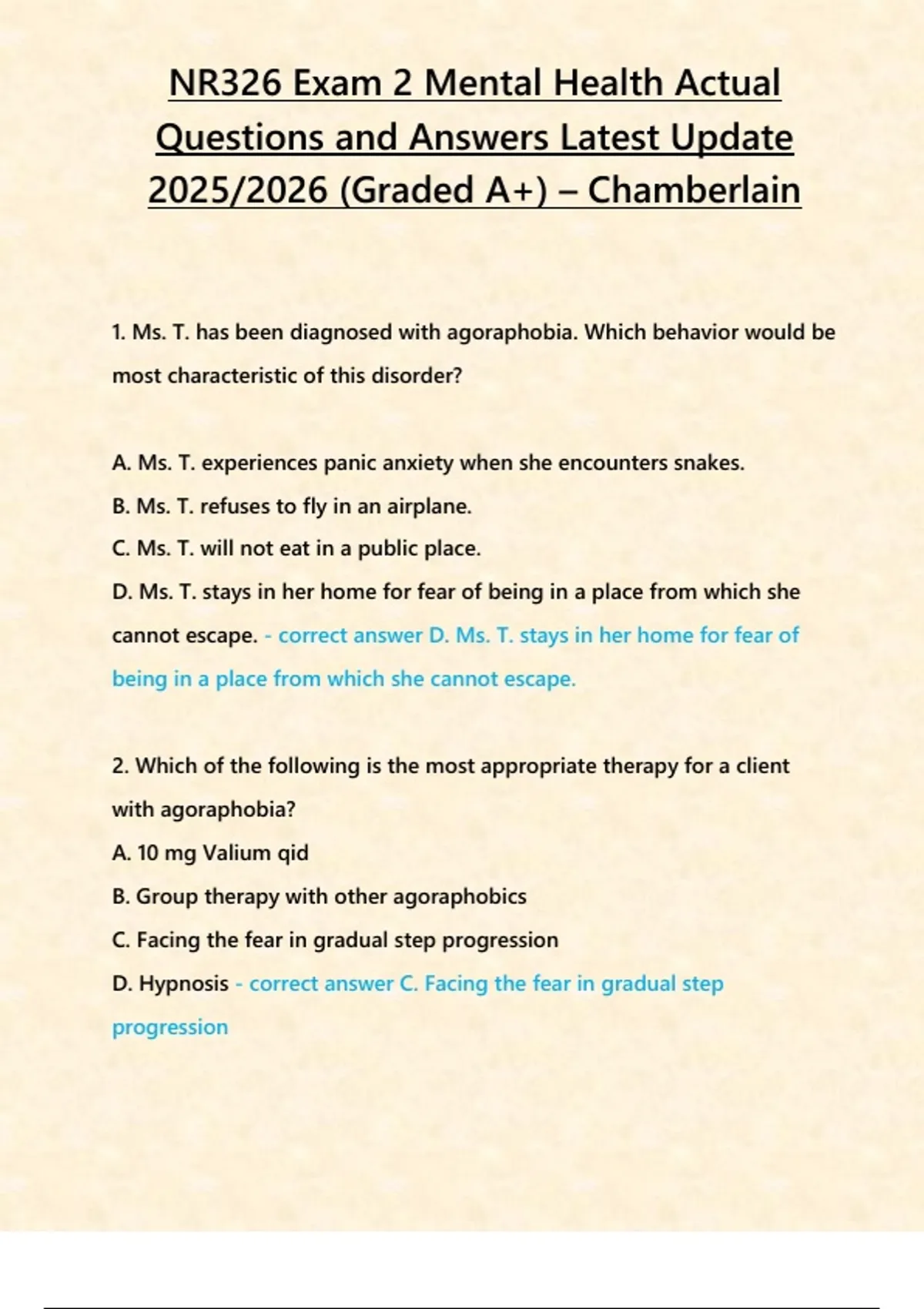 Prepare for NR326 Exam 2 in Mental Health with this comprehensive study guide. This resource includes key practice questions, detailed answers, and expert tips to help you succeed in the 2026/2027 exam. Master the essential concepts and boost your confidence for the exam. Keywords: