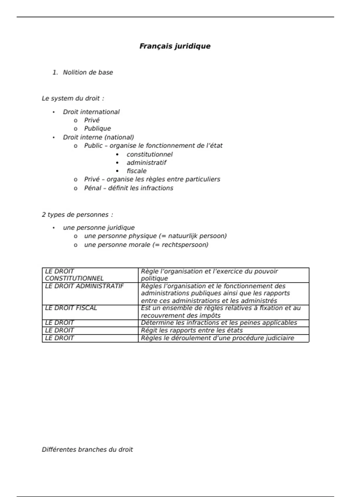 Deze overzichtelijke en gestructureerde samenvatting biedt een duidelijke introductie tot het juridisch Frans, met focus op het Belgische en Europese rechtssysteem. De leerstof is helder uitgelegd aan de hand van schema’s, tabellen, juridische termen en praktische voorbeelden, waardoor de stof vlot te begrijpen en gemakkelijk te studeren is.