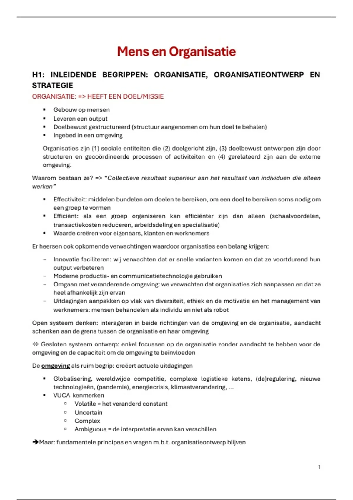H1: INLEIDENDE BEGRIPPEN: ORGANISATIE, ORGANISATIEONTWERP EN