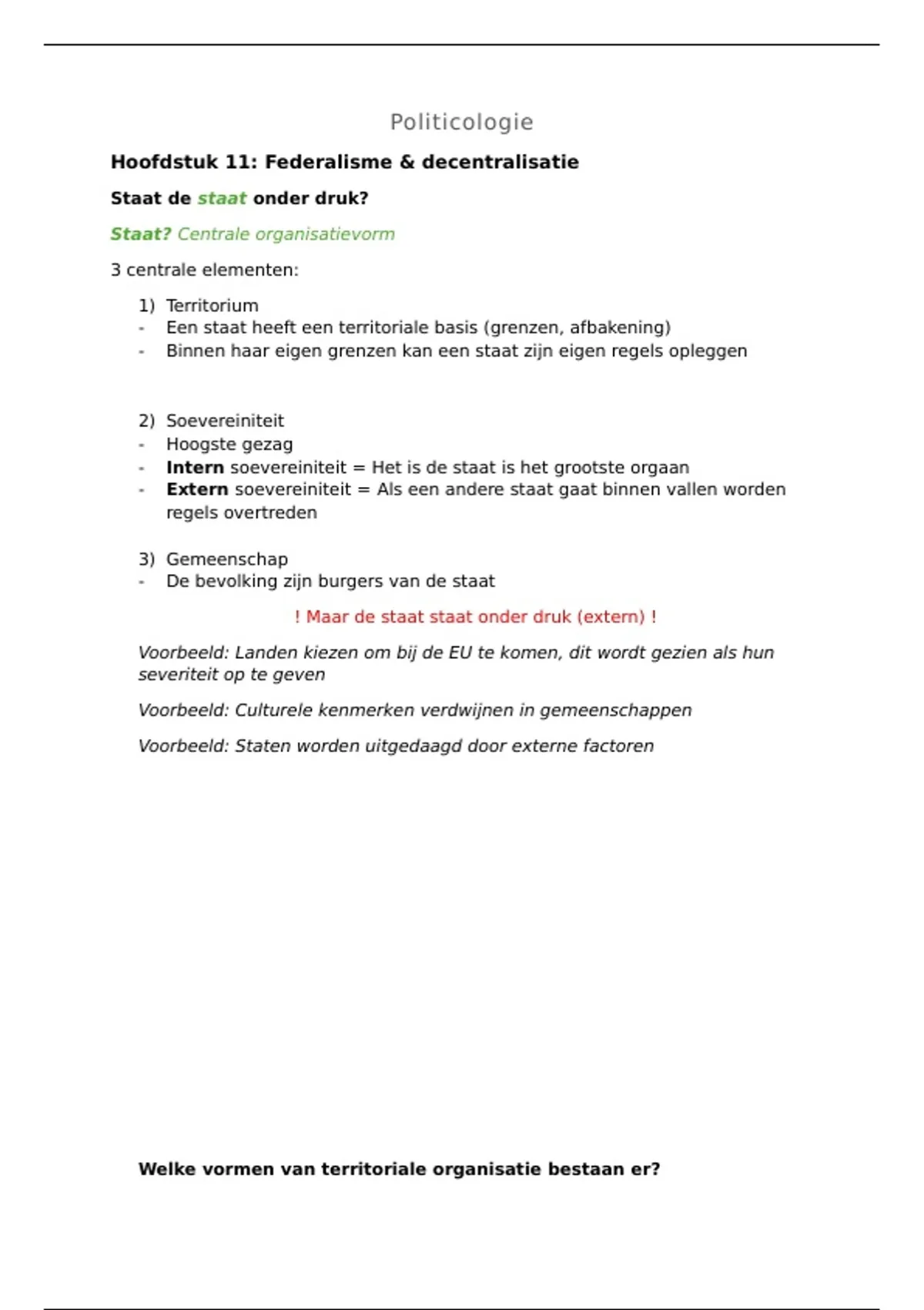 Hoofdstuk 11: Federalisme & decentralisatie Legenda: GROEN = Termen uitgelegd ORANJE = Verklaren van een fenomeen "waarom vraag beantwoorden"