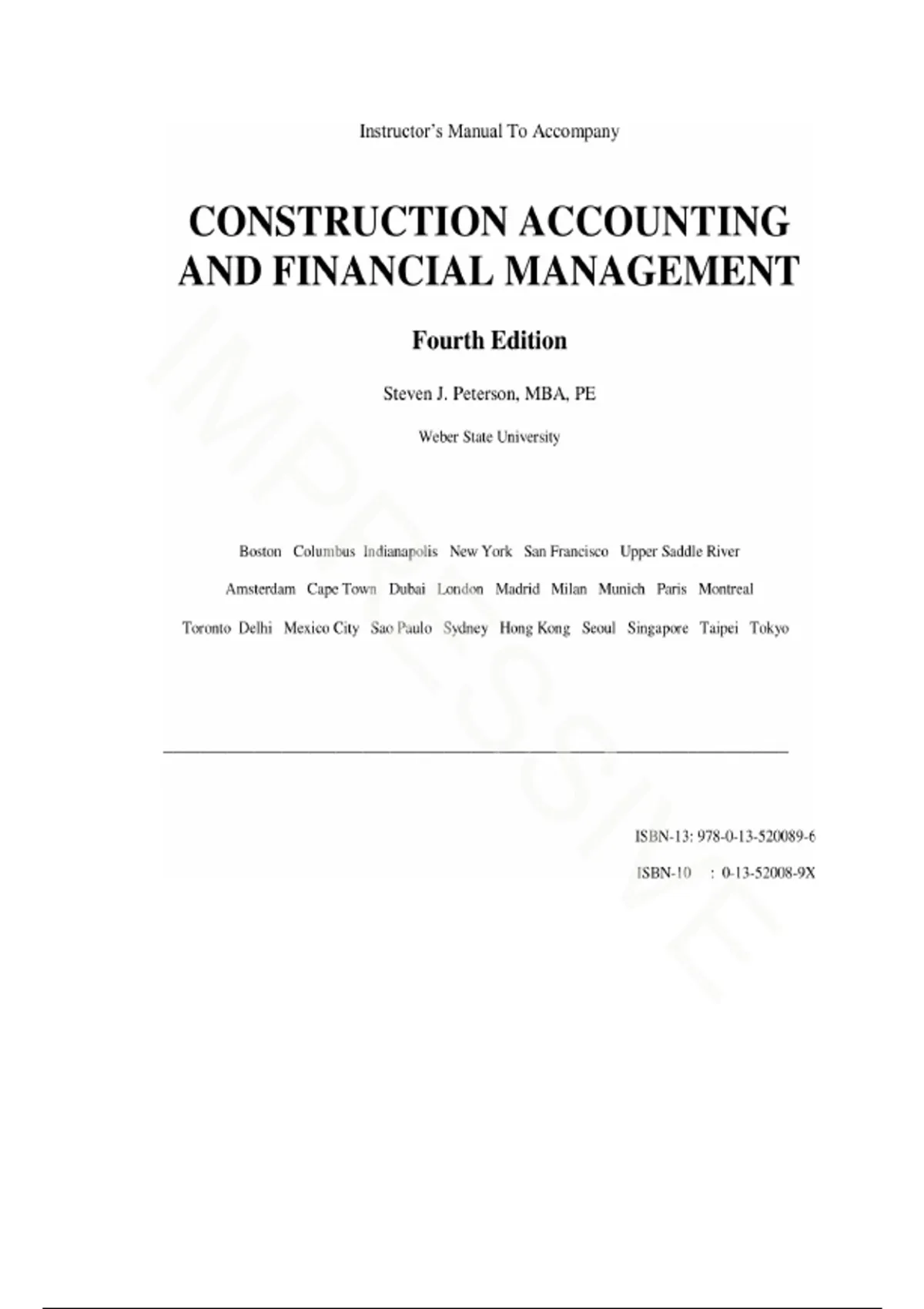 Secure your academic success in construction management with the official-style Solution Manual and Instructor’s Manual for "Construction Accounting and Financial Management," 4th Edition by Steven J. Peterson (ISBN: 978-0-13-520089-6). This essential study resource provides expert-verified, step-by-step solutions to every textbook problem, ensuring you master the financial complexities of the construction industry. Why this study guide is a must-have: • Comprehensive Chapter Coverage: Detailed answers for all 18 chapters, including accounting transactions, depreciation, and financial statement analysis. • Master Construction Systems: Learn the critical differences between cash, accrual, and percentage of completion accounting, and understand how to track retention separately. • Step-by-Step Financial Calculations: Full breakdowns for calculating labor burden markups, Capital Cost Allowance, and straight-line vs. declining-balance depreciation. • Advanced Cost Management: Expert guidance on tracking committed costs, managing general overhead, and calculating overbillings and underbillings to see a clear picture of company finances. • Decision-Making Frameworks: Detailed solutions for Net Present Value (NPV), internal rate of return, and payback period with interest to assist in selecting the best financial alternatives. • Updated Tax Insights: Includes information on the Tax Cuts and Jobs Act and how it affects income tax regulations and financial decisions. Key Topics Detailed: • Cash Flow Mastery: Projections for both individual construction projects and the construction company as a whole. • Financial Analysis: Deep dives into liquidity, profitability, and leverage ratios, including current and quick ratios. • Bidding Strategies: How to set profit margins, determine breakeven points, and track competitor markups. This manual is the perfect companion for students and construction professionals looking to verify their work and improve their financial decision-making speed..