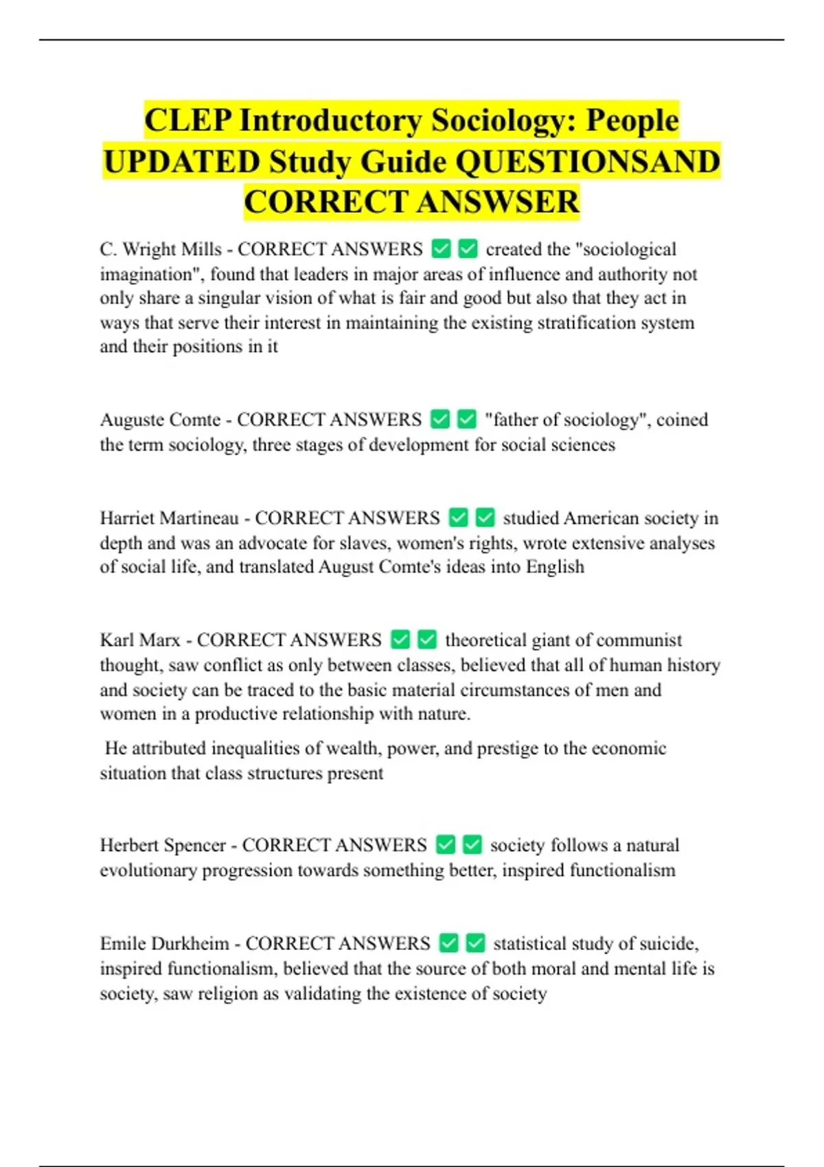 CLEP Introductory Sociology: People UPDATED Study Guide QUESTIONSAND CORRECT ANSWSER C. Wright Mills - CORRECT ANSWERS created the "sociological imagination", found that leaders in major areas of influence and authority not