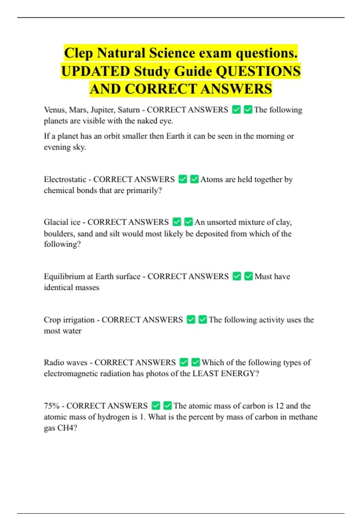 Clep Natural Science exam questions. UPDATED Study Guide QUESTIONS AND CORRECT ANSWERS