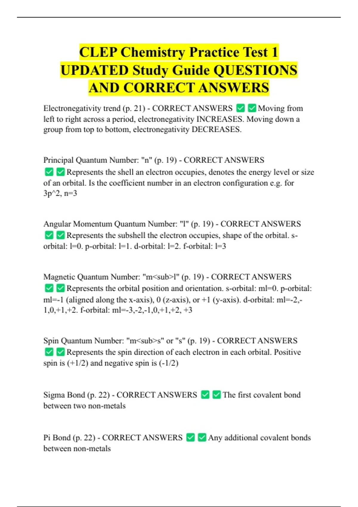 CLEP Chemistry Practice Test 1 UPDATED Study Guide QUESTIONS AND CORRECT ANSWERS Electronegativity trend (p. 21) - CORRECT ANSWERS Moving from left to right across a period, electronegativity INCREASES. Moving down a group from top to bottom, electronegativity DECREASES.