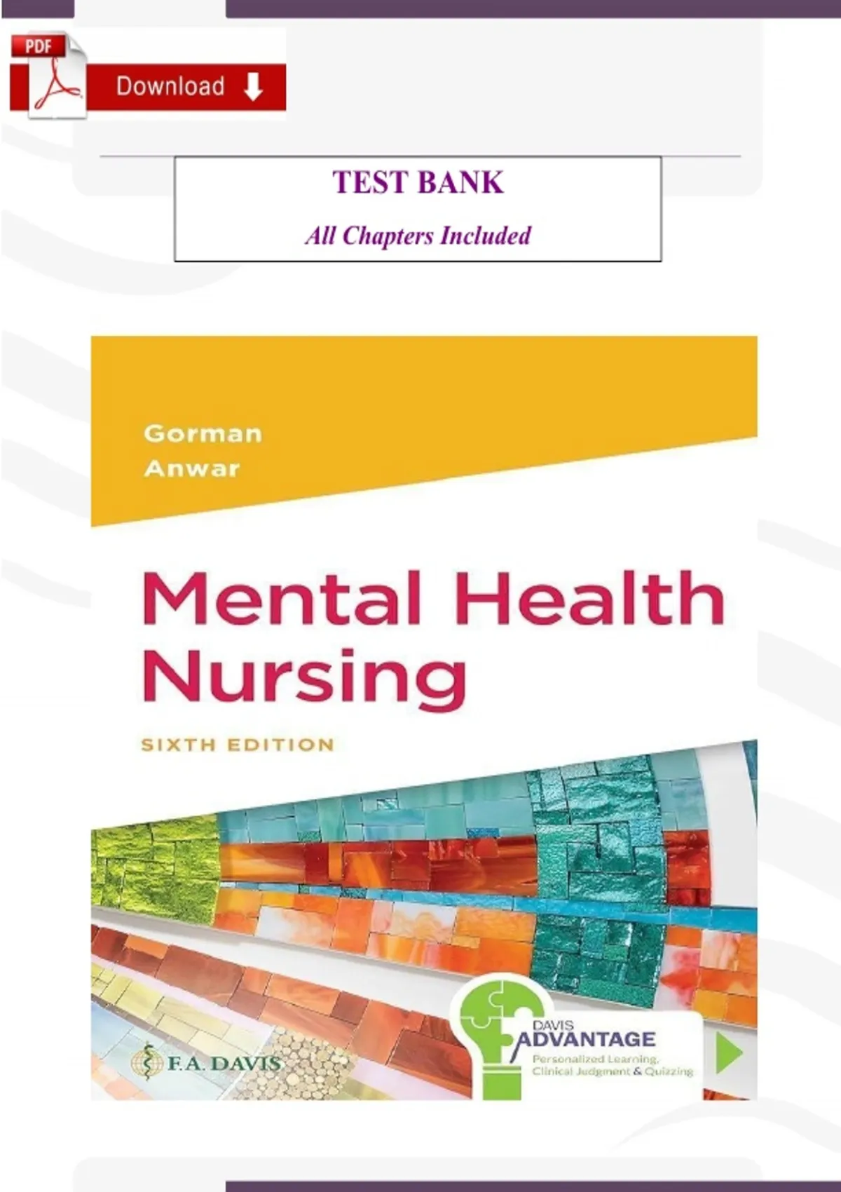 The Mental Health Nursing (6th Edition) – Verified Test Bank by Linda Gorman & Robynn Anwar is a comprehensive exam preparation resource designed for nursing students, educators, and healthcare professionals. This test bank is carefully aligned with the 6th Edition of Mental Health Nursing, ensuring accuracy, relevance, and reliability. It provides a wide range of exam‑style questions, detailed rationales, and structured answers that mirror the complexity of nursing school assessments and professional certification exams. Mental health nursing is a vital component of healthcare education, focusing on psychiatric disorders, therapeutic communication, evidence‑based interventions, and patient‑centered care. Students must master topics such as anxiety, depression, schizophrenia, bipolar disorder, substance use disorders, crisis intervention, and community mental health. Without structured practice, it can be overwhelming to retain and apply this knowledge in academic and clinical settings. This verified test bank simplifies the learning process by offering exam‑focused questions that reinforce critical thinking, patient safety, and professional responsibility. Each question is designed to reflect the textbook’s content, helping learners build confidence and competence in mental health nursing. Key Features Complete coverage of all chapters in the 6th Edition textbook Multiple‑choice, case‑based, and application questions for diverse practice Detailed rationales explaining correct and incorrect answers Exam‑ready format that prepares students for nursing school exams and NCLEX preparation Time‑saving structure for efficient revision and targeted study Benefits for Students This test bank is an invaluable tool for nursing students who want to excel in mental health nursing. It helps learners: Strengthen understanding of psychiatric disorders and therapeutic interventions Practice exam strategies with realistic, high‑yield questions Build confidence in applying theoretical knowledge to patient care scenarios Save study time by focusing on essential, exam‑relevant content Improve performance in nursing school and licensing exams Benefits for Educators Nursing faculty can use this resource to: Create quizzes, assignments, and exams quickly Assess student comprehension effectively Provide structured feedback with rationales Ensure alignment with the Mental Health Nursing, 6th Edition textbook Who Should Use This Resource Nursing students preparing for exams and NCLEX certification Educators designing course assessments and evaluations Healthcare professionals refreshing psychiatric nursing knowledge Anyone seeking a reliable, exam‑focused study tool Why Choose This Verified Test Bank Trusted by nursing programs worldwide, this verified test bank is carefully crafted to match the textbook content, ensuring accuracy and relevance. By practicing with these questions, learners not only memorize theoretical concepts but also develop the ability to apply them in clinical scenarios—an essential skill for safe and effective mental health nursing practice. With this resource, you can reduce stress, save time, and achieve better results in your nursing exams.