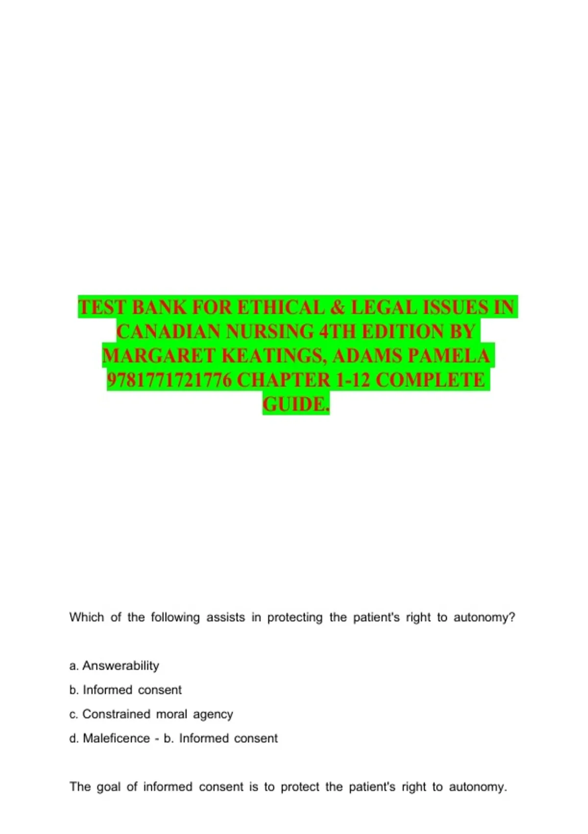 Complete Test Bank for Ethical & Legal Issues in Canadian Nursing, 4th Edition by Margaret Keatings & Pamela Adams. Includes all chapters (1-12) with exam questions, case studies, and legal scenario rationales. Essential for Canadian nursing students, NCLEX prep, and nursing ethics instructors. Instant digital download.