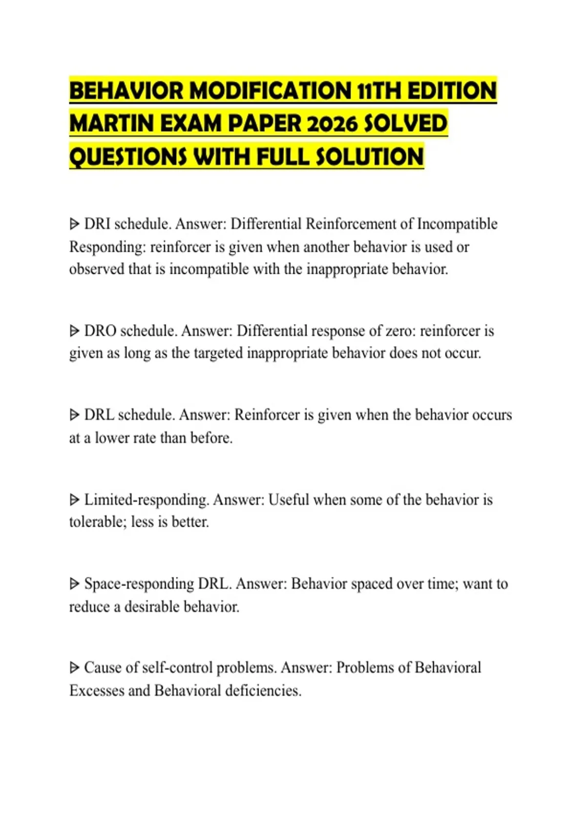 BEHAVIOR MODIFICATION 11TH EDITION MARTIN EXAM PAPER 2026 SOLVED QUESTIONS WITH FULL SOLUTION