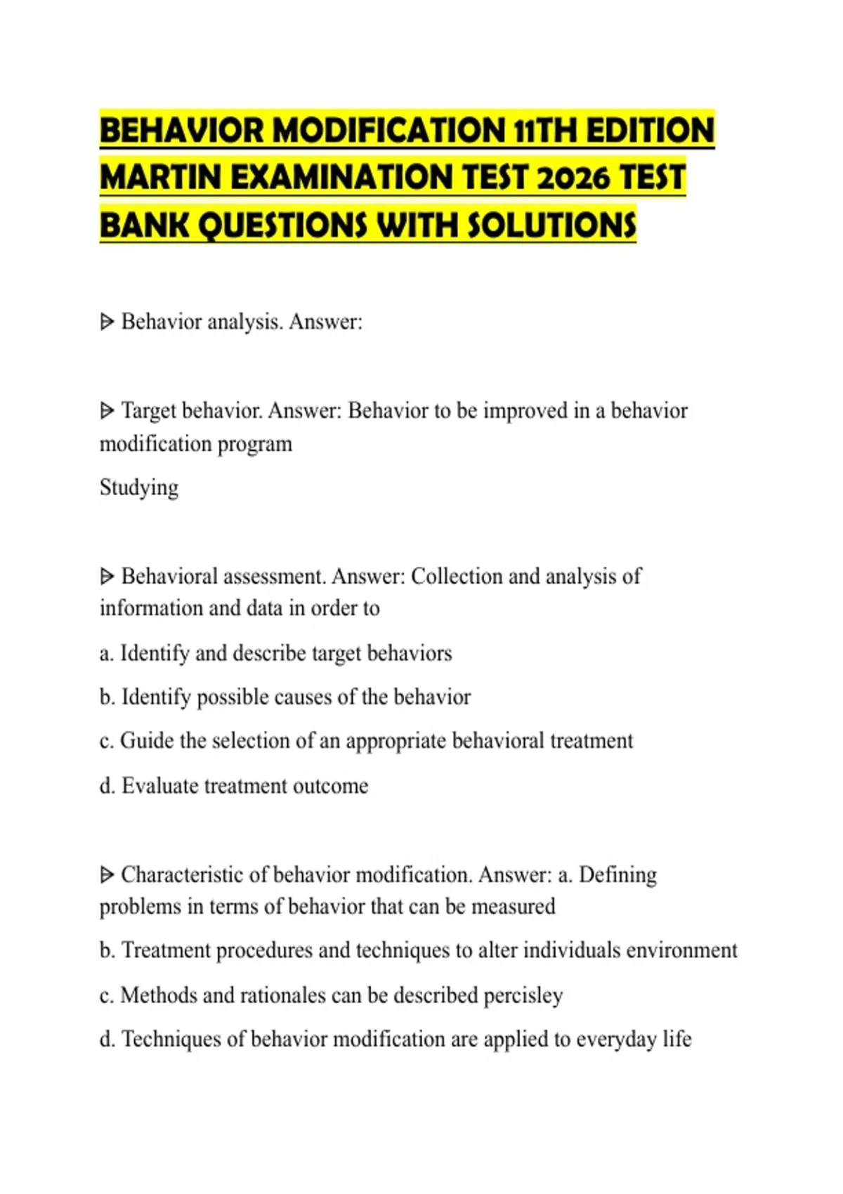 BEHAVIOR MODIFICATION 11TH EDITION MARTIN EXAMINATION TEST 2026 TEST BANK QUESTIONS WITH SOLUTIONS