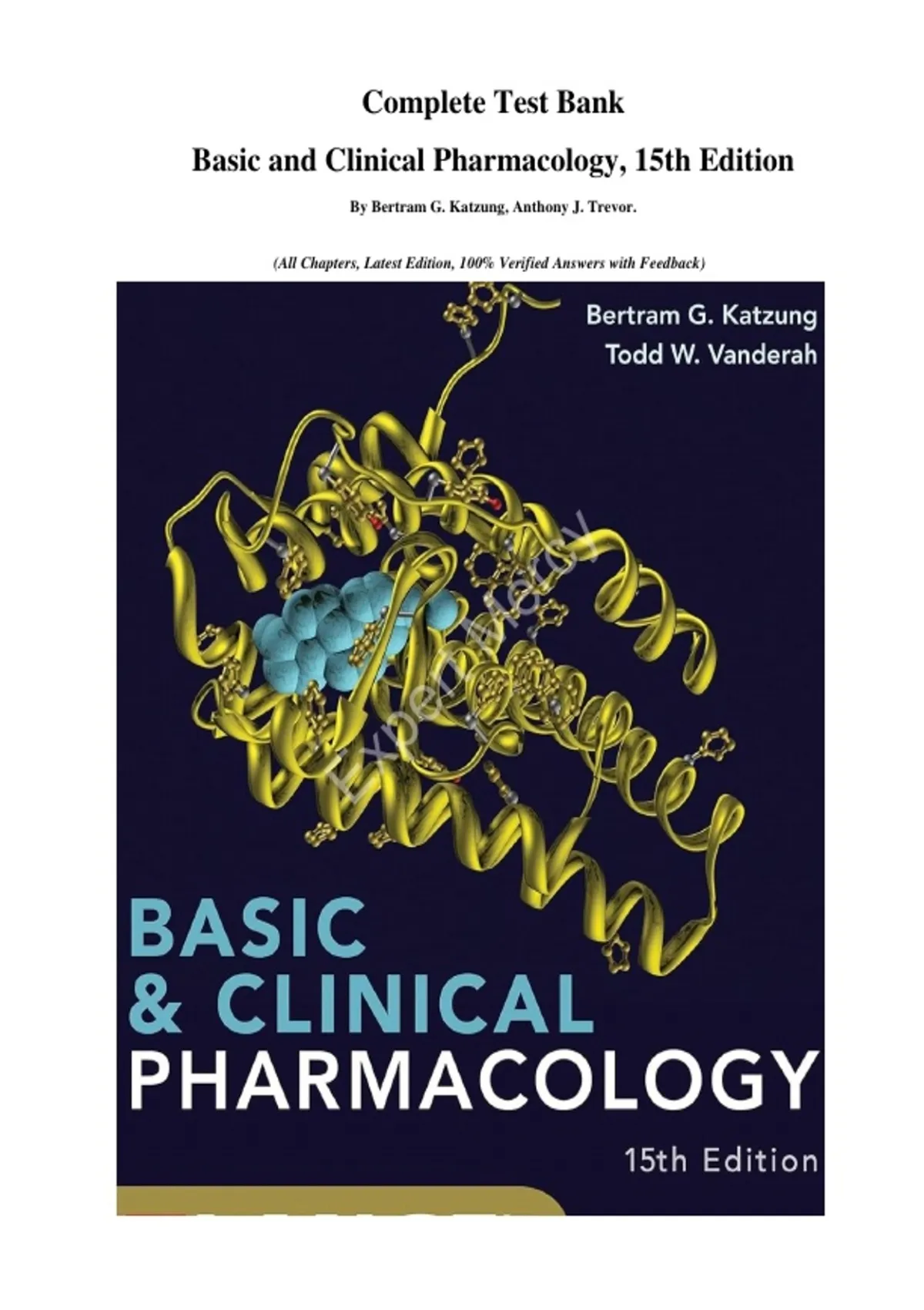 Complete Test Bank Basic and Clinical Pharmacology, 15th Edition. By Bertram G. Katzung, Anthony J. Trevor. (All Chapters, Latest Edition, 100% Verified Answers with Feedback) Basic and Clinical Pharmacology, 15th Edition by Bertram G. Katzung and Anthony J. Trevor is a trusted, comprehensive guide designed for medical, nursing, pharmacy, and health science students. This edition delivers a clear and clinically focused overview of all aspects of medical pharmacology, including prescription drugs, botanicals, and over-the-counter medications. It features majorly revised chapters on high-impact areas such as immunopharmacology, CNS drugs, antidiabetics, anti-inflammatory agents, antivirals, and more, ensuring alignment with modern clinical practice. A new chapter on cannabis pharmacology addresses an increasingly relevant topic in healthcare. Each chapter begins with a realistic case study, explains drug classes and prototypes, and concludes with concise summary tables, diagrams, and Trade Name/Generic Name references for quick review. Enhanced full-color illustrations clarify mechanisms of action, while updated content includes new drugs and discoveries through May 2019, making this edition an essential, up-to-date pharmacology resource.
