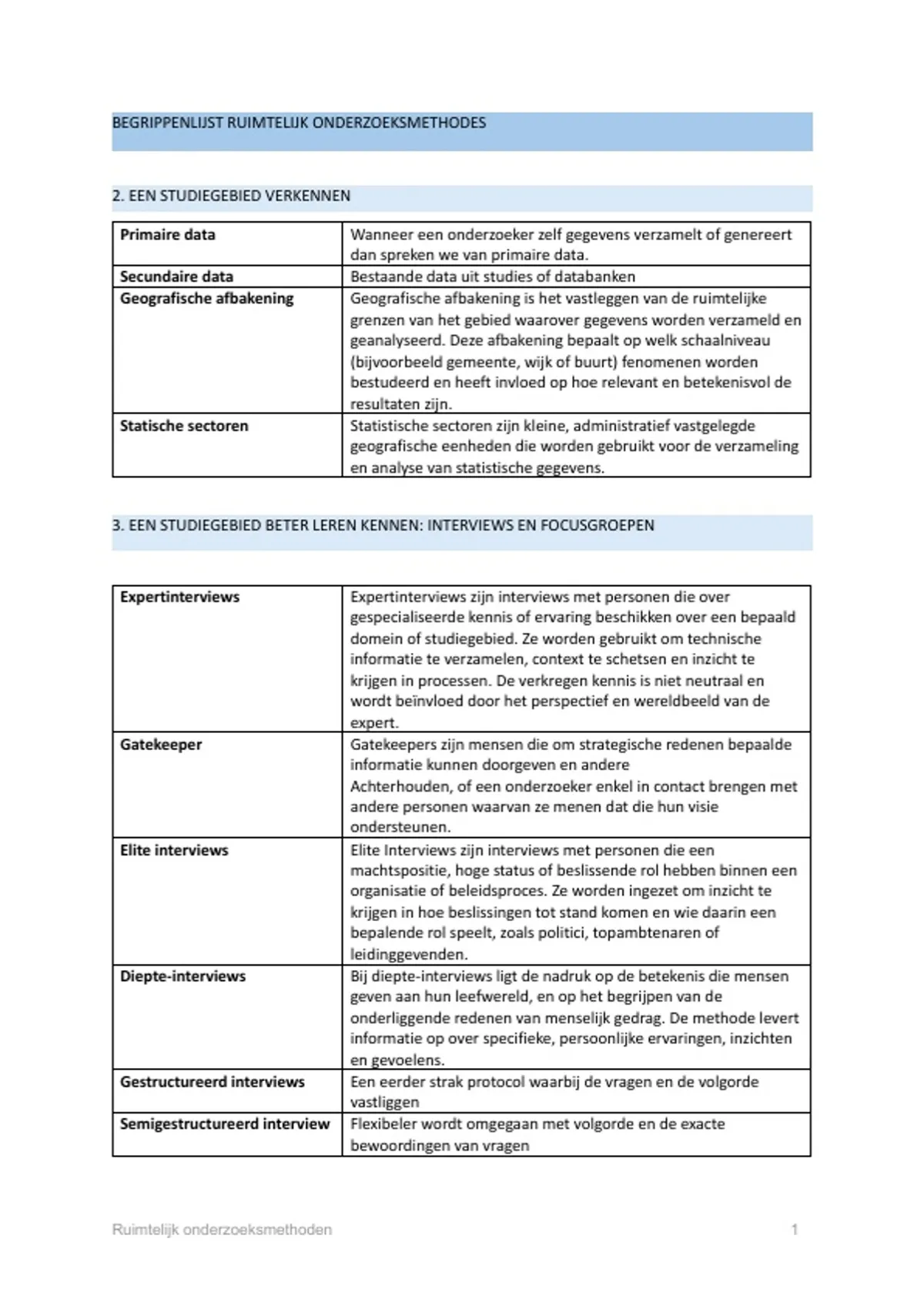 Samenvatting Begrippenlijst ruimtelijk onderzoeksmethodes