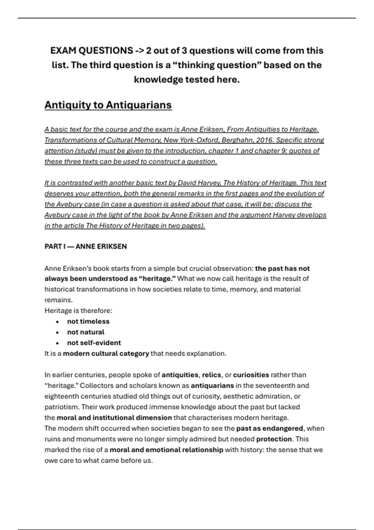 A basic text for the course and the exam is Anne Eriksen, From Antiquities to Heritage.