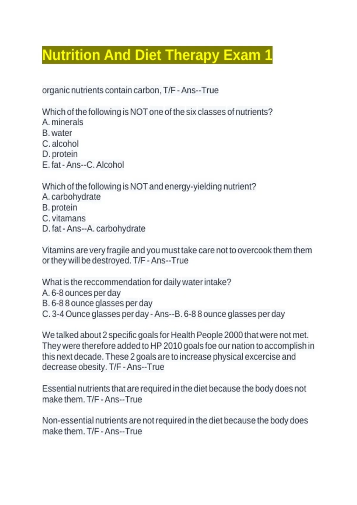 Nutrition And Diet Therapy Exam 1