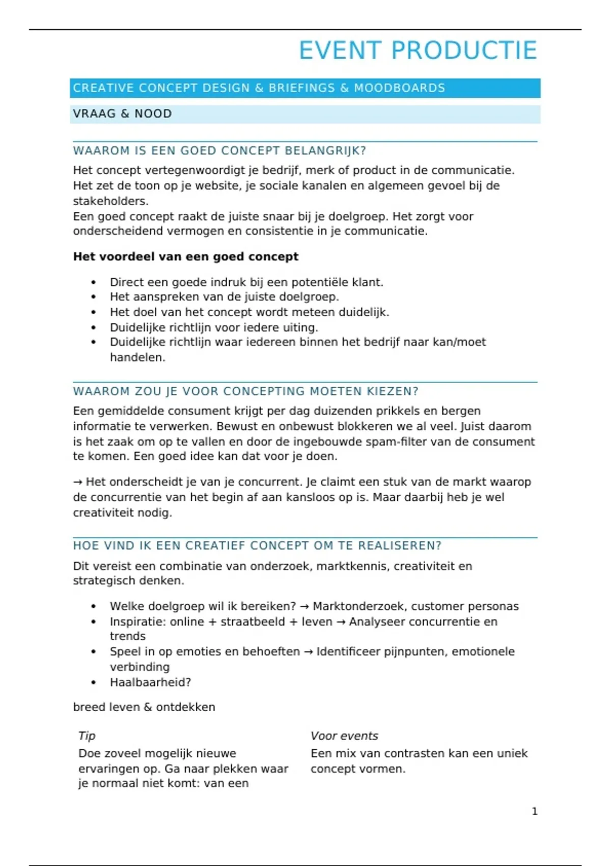 Deze volledige samenvatting van Event Productie biedt een unieke combinatie van theorie en praktijk, inclusief alle gastcolleges en bedrijfsbezoeken. Het document is ideaal voor studenten die het vak snel, duidelijk en examengericht willen beheersen, zonder eindeloos slides of notities te moeten doorzoeken. Creative Concept Design, Briefings & Moodboards - Vraag & nood, Briefing, Inspiratie & vorm, Moodboard, Uitvoer & styling Draaiboek & Eventdocs - Draaiboek, Eventdocumenten, Stock, F&B, Event catering Legaliteit - Wetgeving, Keuzes maken Hospitality - Hospitality: het begrip, Guest journey, Employee journey, Hospitality management Student Kick-off – Bezoek - Organisatiestructuur, Grondplan & terreinopbouw, Productie & techniek, Financieel & partners, Programma, Audio-visueel, Hospitality & beleving Horeca Expo – Bezoek John & Jane – Gastcollege - Algemeen, How it started, Audio, Visuele, Ook corporate events, briefing, Doorloop & repetitie, Productie en organisatie, Sound 101, Power to the people Meet Marcel – Gastcollege - Creatieve mindset, Curiosity, Accelerate, Unarmoured, Divergent, Endlessness, Authenticity Very Food Catering – Gastcollege - “Taking care of people is what we do”, Soorten catering, Cateringflow, Wat doen ze, 8 focuspunten