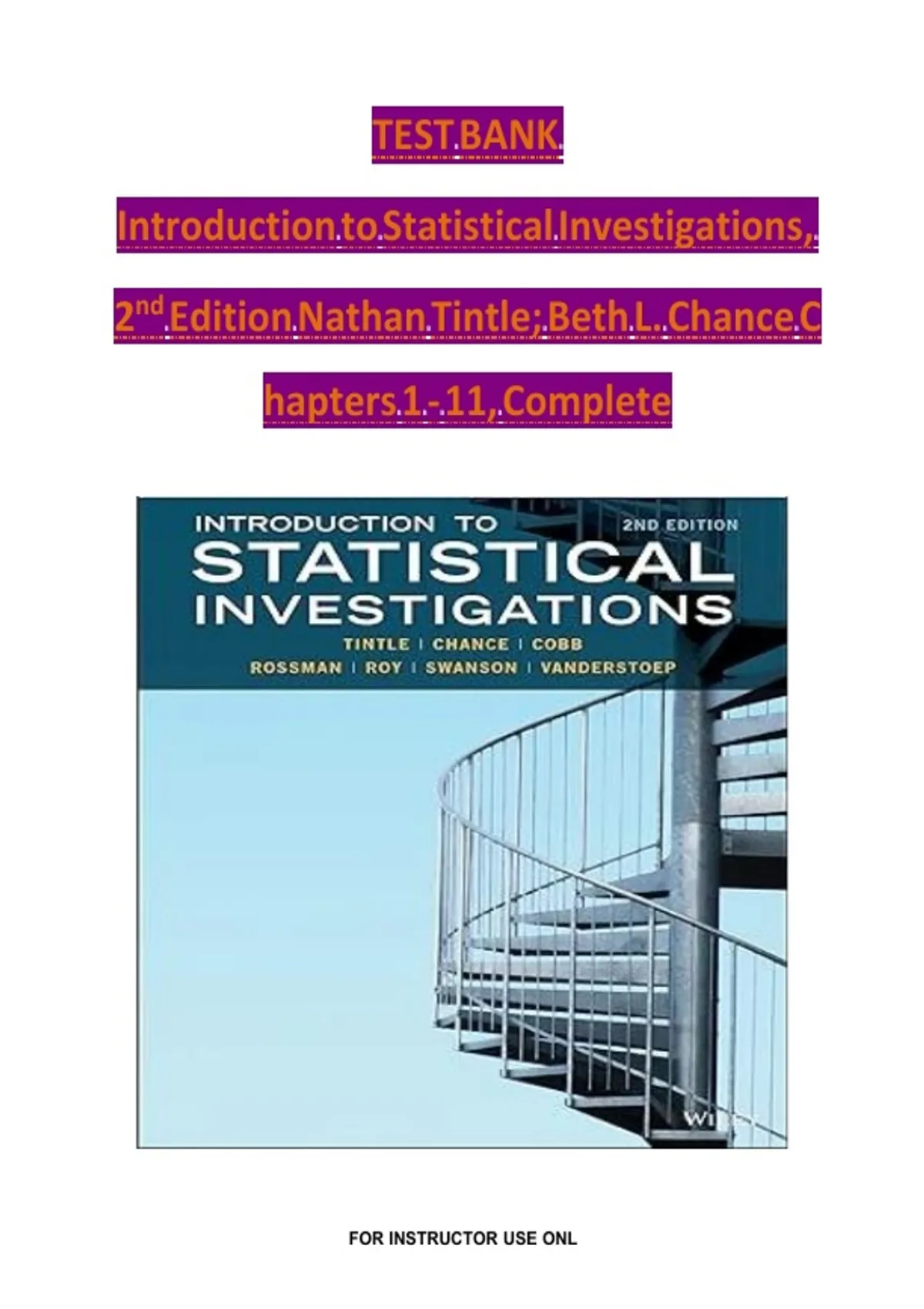 Boost your grades with the official Test Bank for Introduction to Statistical Investigations 2nd Edition by Beth L. Chance, Nathan Tintle, and colleagues. This comprehensive resource features over 300 questions covering simulation-based inference, the six-step statistical method, and data analysis to help you master introductory statistics.
