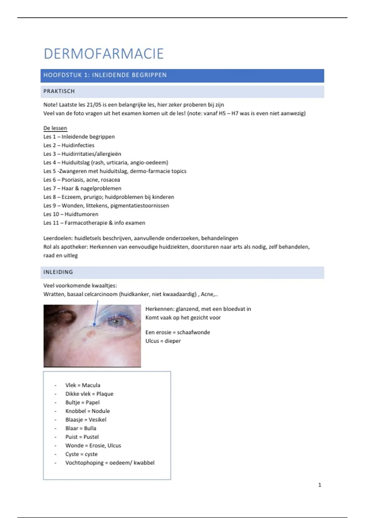 Een samenvatting van het vak dermofarmacie, gegeven in de 1e Master van de Farmaceutische Wetenschappen aan de Universiteit Antwerpen. De samenvatting bevat ook foto's om alles te kunnen herkennen, zoals dit ook op het examen wordt gevraagd.