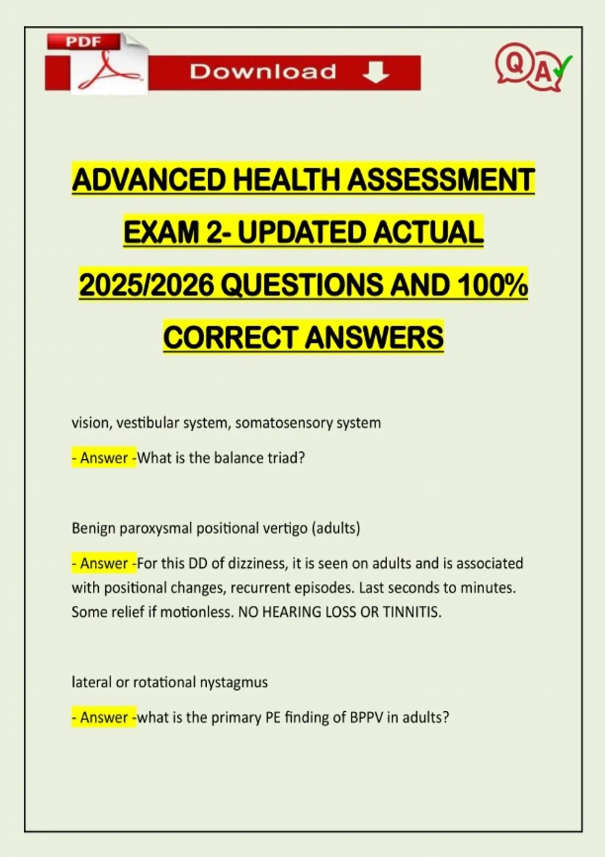ADVANCED HEALTH ASSESSMENT EXAM 2- UPDATED ACTUAL 2025/2026 QUESTIONS AND 100% CORRECT ANSWERS vision, vestibular system, somatosensory system - Answer -What is the balance triad? Benign paroxysmal positional vertigo (adults) - Answer -For this DD of dizziness, it is seen on adults and is associated with positional changes, recurrent episodes. Last seconds to minutes. Some relief if motionless. NO HEARING LOSS OR TINNITIS. lateral or rotational nystagmus - Answer -what is the primary PE finding of BPPV in adults?Need assistance on Online classes, Exams & Assignments? Reach out for instant help!! Full Course Assistance, Plagiarism-free Essay Writing, Research Paper, Dissertation, Discussion Posts, etc…. Confidential & Secure services. Tutors are available for all subjects! Email now at: Dix-Hallpike maneuver, electronystagmography (ENG) - Answer -What are the diagnostic tests used to diagnose DPPV in adults? Benign paroxysysmal positional vertigo (children) - Answer -For this DD of dizziness, it is seen in children aged 2-3 years old with sudden onset of crying. N/V, nystagmus, pallor, sweating