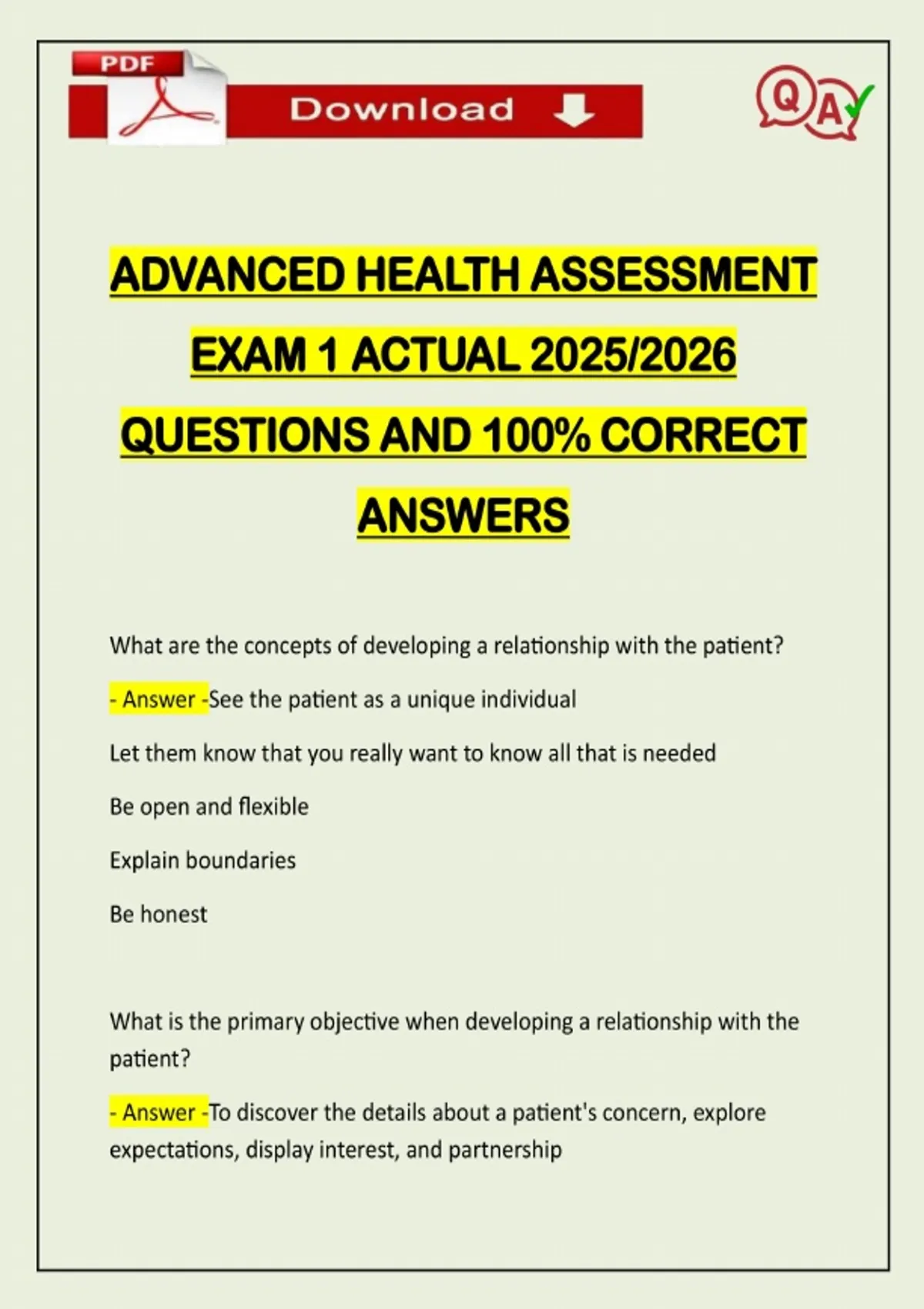 ADVANCED HEALTH ASSESSMENT EXAM 1 ACTUAL 2025/2026 QUESTIONS AND 100% CORRECT ANSWERS What are the concepts of developing a relationship with the patient? - Answer -See the patient as a unique individual Let them know that you really want to know all that is needed Be open and flexible Explain boundaries Be honest What is the primary objective when developing a relationship with the patient? - Answer -To discover the details about a patient's concern, explore expectations, display interest, and par