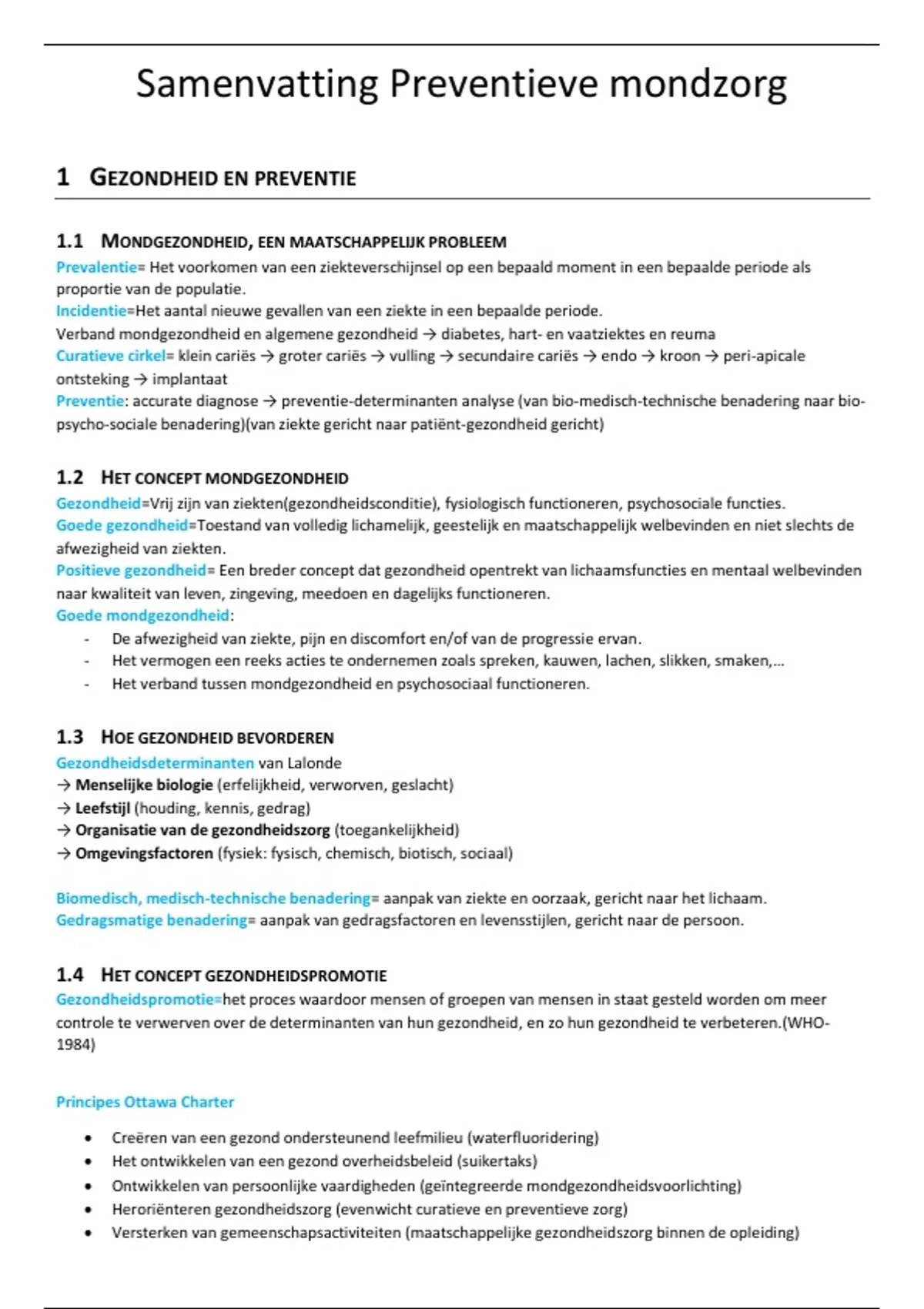 Complete samenvatting en oefenvragen preventieve mondzorg voor studenten. Behandelt gezondheidspromotie, epidemiologie, fluoride-advies, mondhygiëne, voeding en rookstop, ideaal voor je opleiding en praktijk. ​ Belangrijkste onderwerpen - Gezondheid en epidemiologie: Mondgezondheid als maatschappelijk probleem, prevalentie/incidentie cariës en parodontitis, indices (DMF-T, plaque-index, DPSI, CPITN, BEWE). - Preventiestrategieën: CRFA (common risk factors), water/zoutfluoridering, sealants, professionele/profylaxe (fluoridegel), individuele adviezen. ​- Vier pijlers: Fluoride (topisch/systemisch, ppm-berekening), mondhygiëne (Bass-methode, elektrisch poetsen, interdentale hulpmiddelen), voeding (suikerfrequentie, erosie), recall en rookstop (Fagerström-test, 5 A's). ​- Risico-assessments: Cariogram (groene/blauwe/rode scores), parodontale PRA, secundaire/tertiaire preventie en gezondheidspromotie (Ottawa Charter).